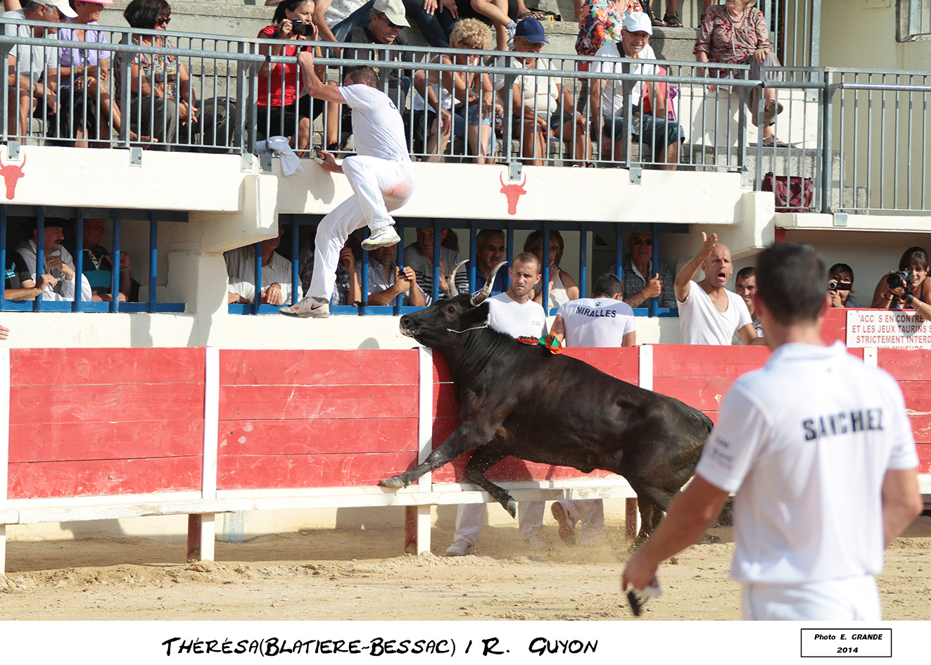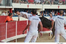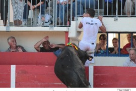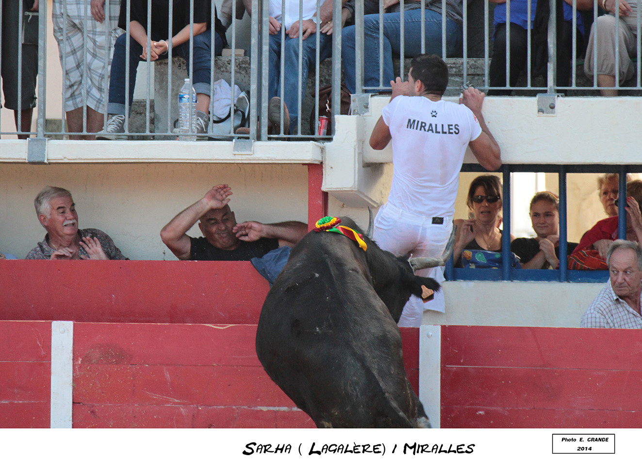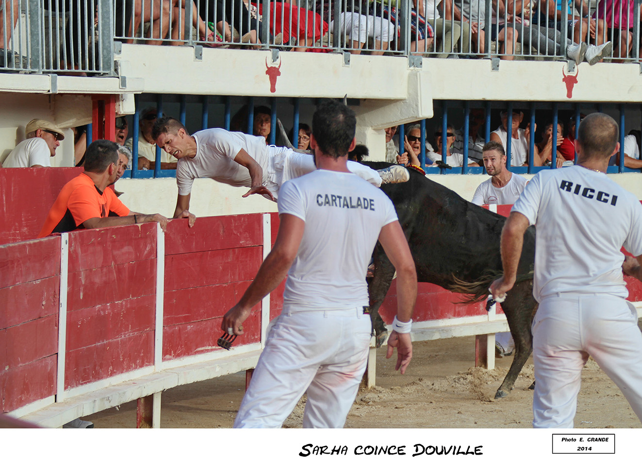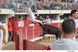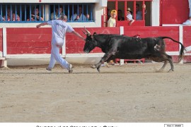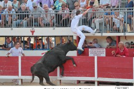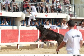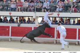 Une fois de plus les arènes du Grau du Roi accueillaient la finale des cocardières. Gradins pleins aux ¾, mais le spectacle a un peu déçu, essentiellement, par la faute des hommes. Ils étaient onze (plus 4 tourneurs) : Clarion, Boyer, Miralles, Guyon, Dumont, Ricci, Douville, Ferriol, Sanchez, Castel et Cartalade. Malgré ces quelques éléments en plus des « habitués » des vaches cocardières, la qualité ne fut pas au rendez-vous. Trop nombreux, trop maladroits (les vaches ont reçu des avalanches de rasets inefficaces), comme d’habitude, on a le sentiment d’être passé à côté de ce qui aurait pu être une bonne course.
