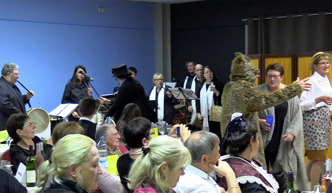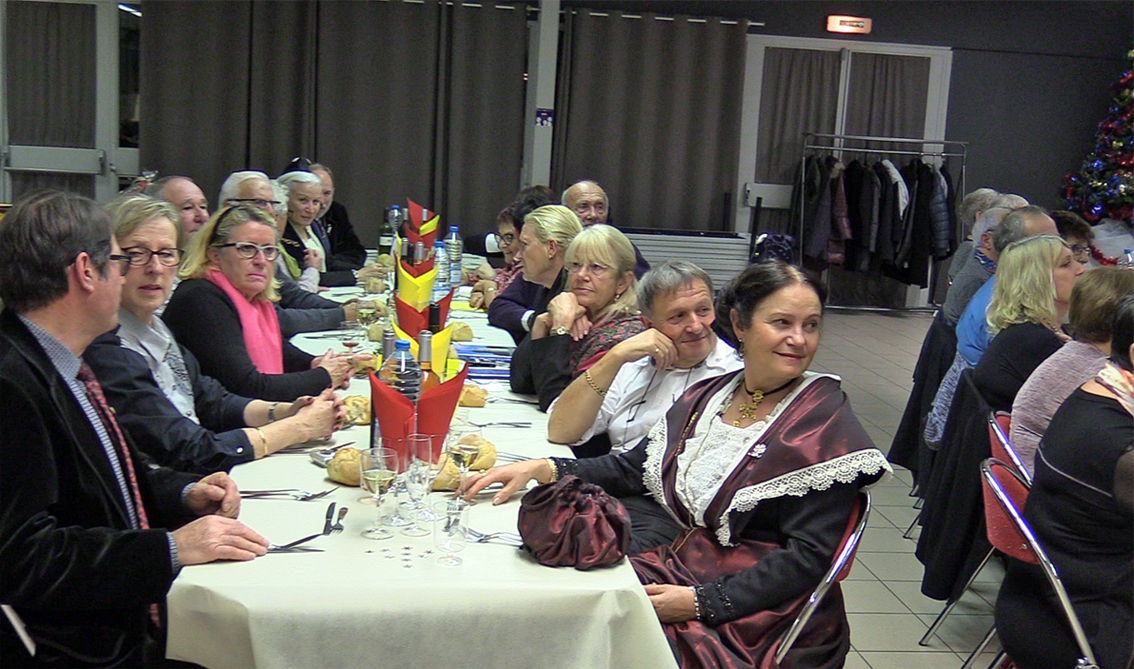 La salle Mistral était presque pleine pour le 3ème Gros Souper de Noël proposé par l’association Sian d’Aqui. En effet, si chaque année il y a une veillée calendale à Vauvert, on alterne avec la soirée des 13 Desserts et le Gros Souper. Rappelons que le Gros souper était à l’origine pris en famille le soir de Noël, avant la messe de minuit et que c’était un repas « maigre », mais non moins fastueux. Le poisson et les produits du terroir y avaient une large place. Pour s’approcher au plus près de la tradition, Sian d’Aqui a fait appel à un traiteur voisin qui a pris soin de reconstituer ces plats, d’une façon quelque peu améliorée. C’est ainsi que les convives ont pu se régaler du céleri en anchoïade, des escargots aux épinards, de la morue à la provençale, du gratin de carde, sans oublier les 13 desserts bien entendu.