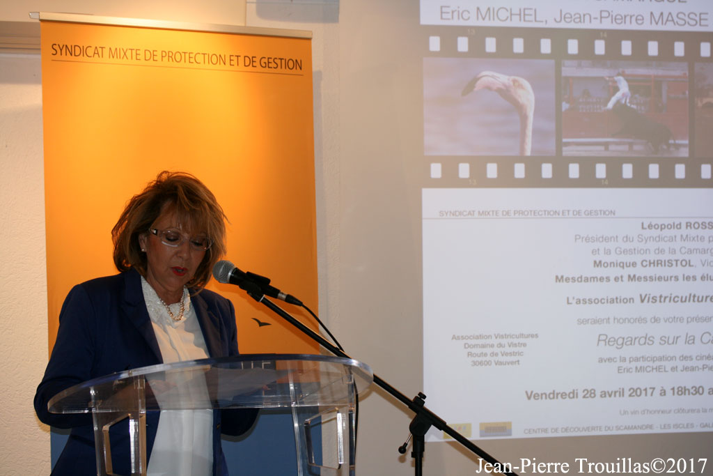 Monique Christol, Vice-Présidente du Syndicat Mixte de la Camargue Gardoise, ouvre la manifestation en félicitant les promoteurs de cette soirée pour leur initiative. Elle va ensuite évoquer, le parcours des deux cinéastes et les nombreux prix qui sont venus récompenser une importante production , qui met en valeur la Camargue et ses traditions. Jean-Luc Bousquet, représentant l’Association Vistricultures, rappelle les particularités de cette dernière qui a pour ambition de soutenir et de mettre en synergie les mondes de la culture, de la recherche scientifique et les activités économiques. Le Vistre, ce cours d’eau traversant plusieurs commune de notre terroir, symbolise le lien entre un territoire et ses habitants. Il l’inonde de son flux créatif et dépose son limon dynamisant. C’est un peu cela l’esprit Vistricultures.