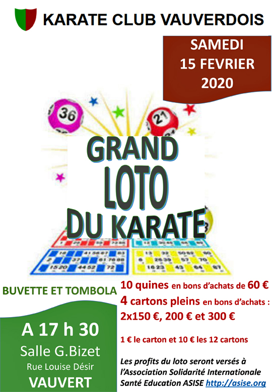 Le Karaté club Vauverdois a organisé samedi 15 février 2020 à la salle Bizet de Vauvert, un grand loto au profit de l’association ASISE (Association Solidarité Internationale Santé Education). Cette association aide toute personne intéressée par des projets d’aide aux personnes défavorisées dans les domaines suivants : humanitaire, éducation, sanitaire et social. Les fonds récoltés lors du loto contribueront grâce au fil rouge des clubs de karaté, à la construction d’une extension de 3 classes au Rwanda.