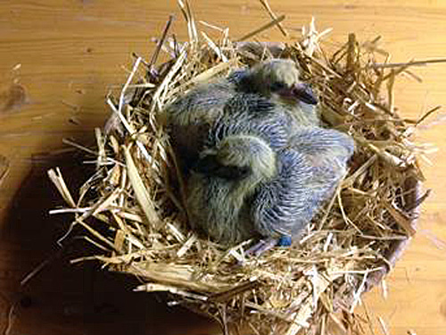 Quelques heures après leur naissance, les pigeonneaux lèvent leur tête pour être nourris par le « lait de jabot » de leurs parents. C’est une sorte de bouillie blanche très nourrissante produite par les parents.