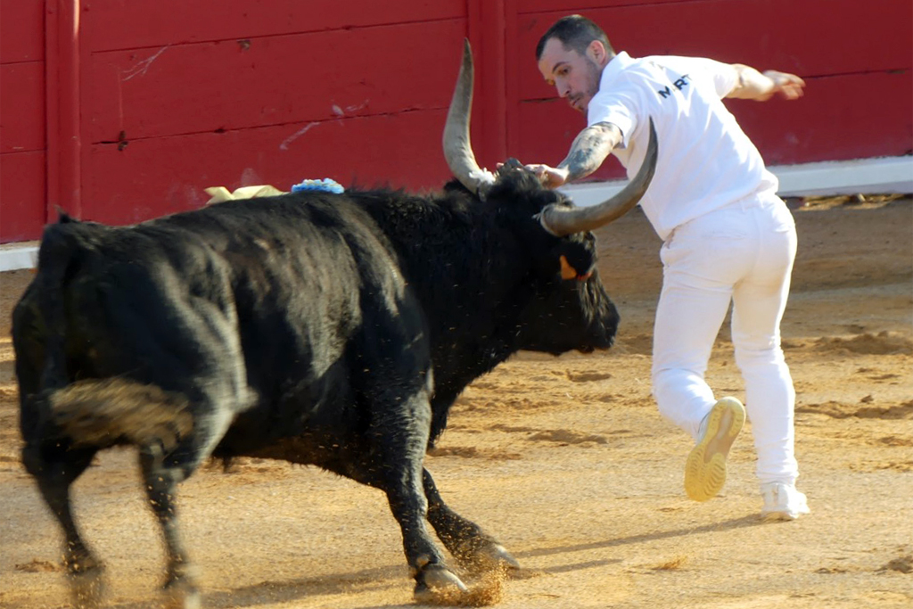Entre et parcourt la piste : son poil d’hiver est encrouté de boue mais ses hautes banes lui gardent toute sa superbe. Il se met au jeu et prend les demandes qui sont couronnées de succès pour les prises d’attributs, coupe pour Félix, cocarde pour El Ghiati, et les glands pour Martin. On passe aux ficelles. Cadenas le sollicite mais Penequet se tourne plutôt vers son tourneur Miralles ; l’attention est à moitié au rendez-vous, mais Cadenas l’oblige à rentrer dans le jeu et sur une longueur, le taureau à ses trousses, le premier Carmen résonne. La ficelle s’effiloche ; Penequet, inconstant parfois dans ses charges peut être puissant et combatif et Félix en fait par deux fois les frais, le voyant se porter à lui avec fougue, le tout en musique couronnant ainsi sa poussée. Cadenas reprend la main, se porte à lui, coupe, Félix suit, coupe et finalement, c’est Marquis qui emporte la ficelle. Rentre sa seconde ficelle en musique après 6 Carmen entendus en piste. Penequet aura mis en jambes les raseteurs.
