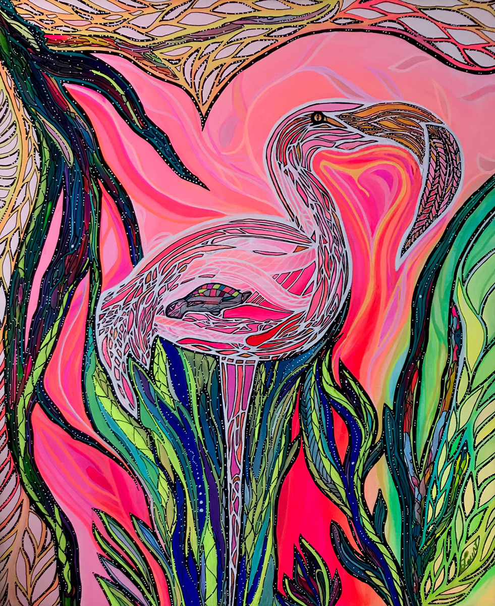 Ses acryliques prennent alors forme et s’améliorent chaque jour, créations qui, de manière générale, sont réalisées sur des châssis en coton ou en lin, mais peuvent aussi se font sur des murs, du bois, peintes de même sur des meubles, des paravents. Sons sens de la finesse l’ont amenée à la création de bijoux sublimes à partir de feuilles d’arbres, de graines d’érables ou de cupules de chênes. Des branches ornent certains châssis, donnant ainsi une troisième dimension à ses créations.
