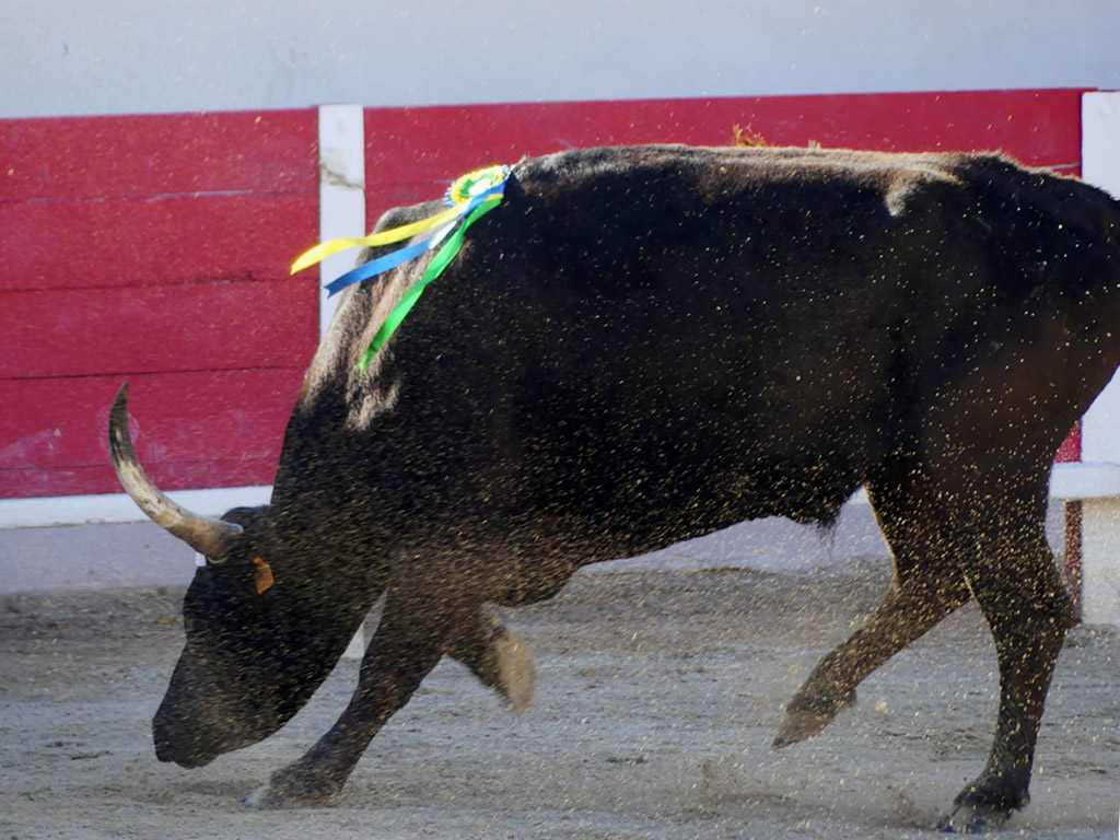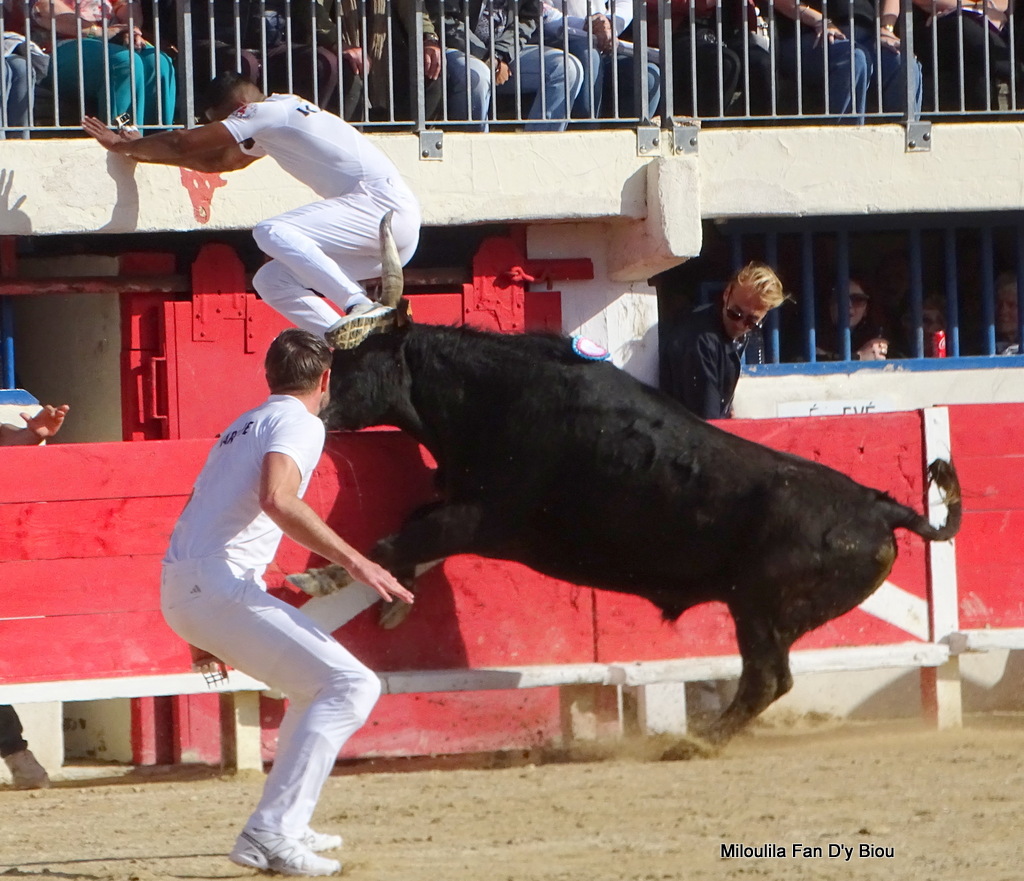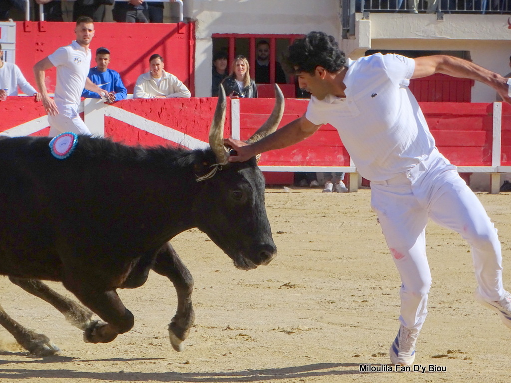 Belle bête, prend le pouls de la piste tout en faisant de belles pointes de vitesse pour évincer les hommes. Il est attentif aux hommes, mais coupe pour Naïm, cocarde et glands pour Marignan. Aux ficelles, Naïm le sollicite si bien qu’il culbute en contre-piste lorsque Gigolo se porte à lui avec force et fracas. Katif rentre en jeu dans un raset de choix qui les mène tous deux à la barrière le tout en musique. Marignan dans l’action entend retentir Carmen. Cadenas s’investit si bien dans le raset qui vrille que le disque retentit tant l’action est sérieuse, pleine, entière jusqu’à la finition comme en délivrance. Brave, Gigolo guerroie, cornes en avant. Droite, gauche, les hommes passent, avec Cadenas en mode coupe de la ficelle, mais Oukharti se met à l’erreur se portant en même temps et par deux fois sur le même raset avec Cadenas. La ficelle est bien entamée, il suffit maintenant de la cueillir, Marignan enlève une touffe, Cadenas s’engage, craque un plus, à gauche Naïm, sûr de l’avoir la revendique plus plus, le président de course ne dit rien, Katif profite du moment de doute et sur la lancée, ficelle dans son crochet. Moment qui fait vaciller… À la deuxième, moment de flottement, à savoir qui osera aller crocheter la ficelle, pas de prétendants ? Le temps se finit, il la rentre en musique sous les applaudissements, par 3 fois Carmen en piste. Franc, brave, combatif dans ses réponses.