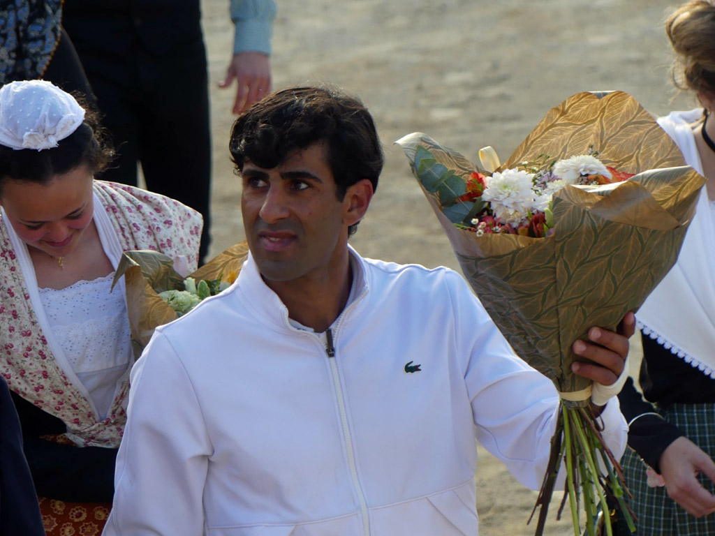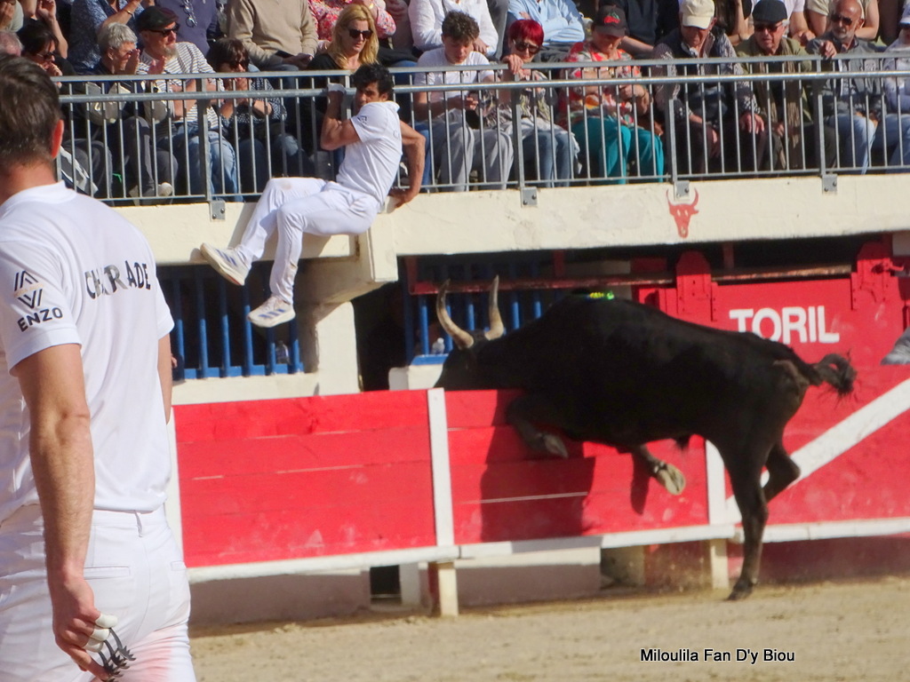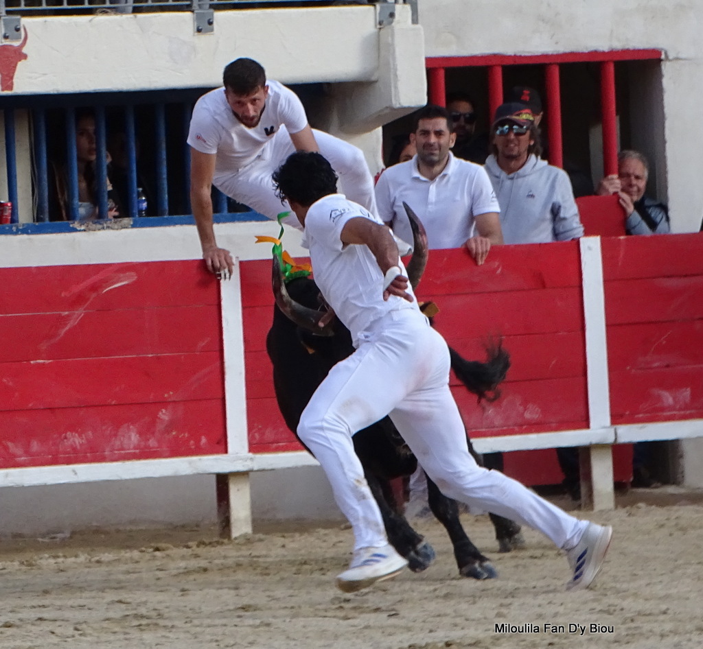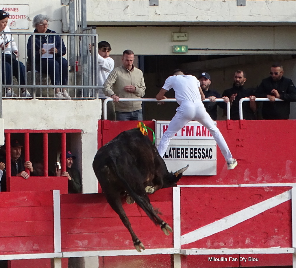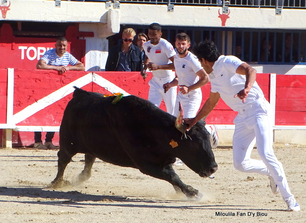 Pour 10 minutes en piste. Pas content d’être en piste, il sort ! Essaye toutefois d’attraper l’homme en contre-piste, pas pour jouer avec. Saute après les raseteurs, Assenat en fait les frais. Quelle envolée derrière Cadenas au son de Carmen tout en prenant la cocarde ; Charrade, Katif, et sauts après eux. Rentre, sort, dégonde de la piste, dégonde de la contre-piste, saute, vole, bascule Oukharti en contre-piste, Naïm, en amateur de gland arrive à le lui prendre, Cadenas se voit obligé de se percher pour éviter la vindicte du taureau, et gland pour Charrade à la dernière minute. Cadenas l’emmène derrière lui et lui montre le passage du toril. En musique sa rentrée, par 4 Carmen en piste.