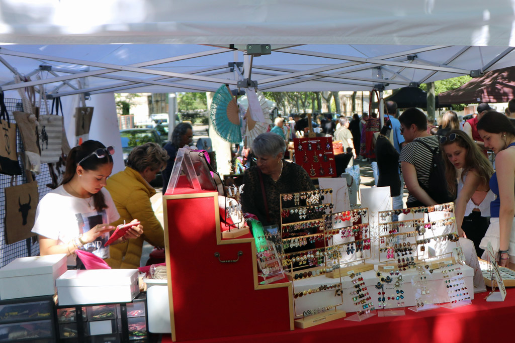 Le 1er mai, de bonne heure, l’Association Sian d’Aqui est présente sur le boulevard Victor Hugo, près des arènes. Les exposants s’installent tranquillement, ils sont une vingtaine avec des bijoux, des sacs de toutes sortes, des ceintures, des couteaux, des vêtements d’enfants, des tableaux et que sais-je encore. Les membres, quant à eux, installent tables, chaises, couverts pour les amis et les gardians venus déguster la «rouille du boucher Dylan et la fougasse sucrée pour le dessert. Puis, tous se dirigent vers les arènes pour la course de 7 taureaux. Nous avons eu la chance d’avoir une journée bien ensoleillée.