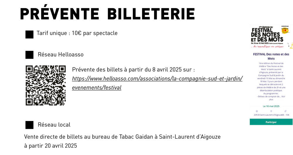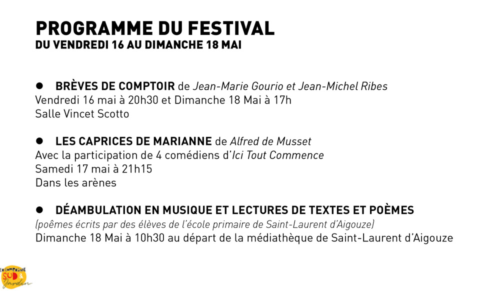 Pour sa première édition, cet évènement culturel de la compagnie de théâtre « Sud et Jardin » proposera durant trois jours, du 16 au 18 mai 2025, des pièces de théâtre et déambulation, avec la particularité pour l’une des pièces proposées de compter entre autre quatre acteurs de la série télévisée « Ici tout commence ».