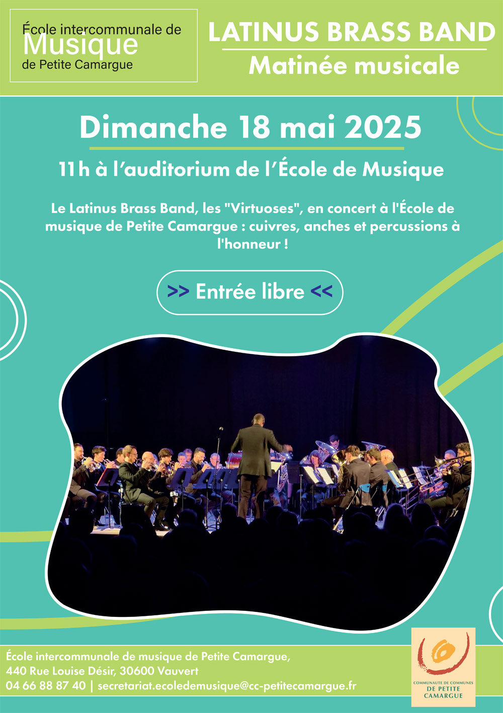 L’École intercommunale de musique de Petite Camargue a le plaisir de vous inviter à vivre un moment musical unique avec le Latinus Brass Band, pour une matinée placée sous le signe de l’énergie et de la virtuosité.