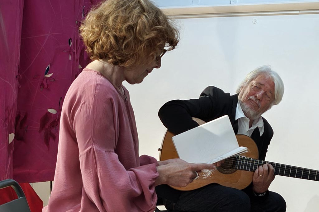 Un public peu nombreux mais de qualité : Anne-Marie Adam, plasticienne, Elise Thiebaut, écrivaine, étaient venues écouter Nicole Bousquet, peintre , Emma Morin, comédienne et metteuse en scène, André Roé qui les accompagna à la guitare puis lira la nouvelle « à la ville et au monde » avec brio et humour.