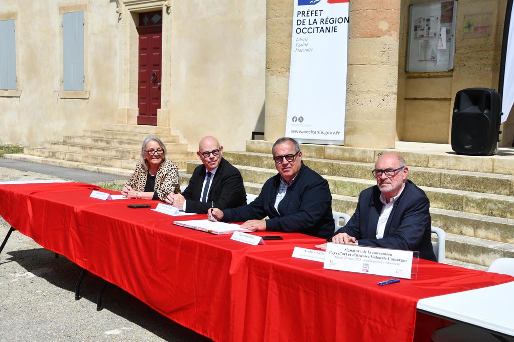 La convention décennale délivrée par la DRAC Occitanie aux 50 communes du PETR Vidourle Camargue, a été signée le 20 mai dernier sur le parvis du Temple de Gallargues-le-Montueux par le Président Pierre Martinez et Michel Roussel, Directeur régional des affaires culturelles de la DRAC Occitanie représentant M. le préfet de la Région Occitanie, préfet de la Haute-Garonne, Pierre-André Durand.