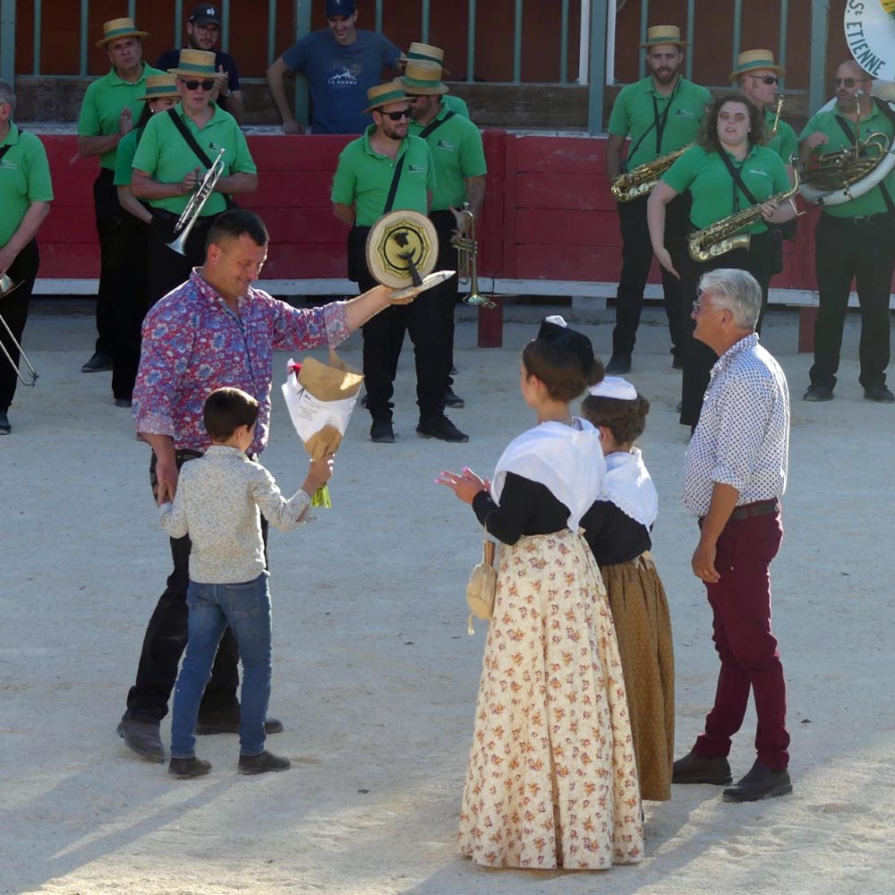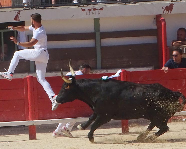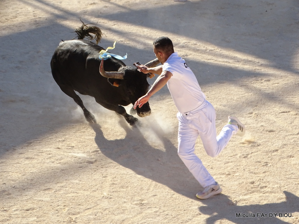 Ficelles : Les hommes hésitent, Montego est tout en mouvement. Prend le raset quand il se présente, tête baissée et cornes en avant. Il domine la piste. Martin s’essaie, il est bien raccompagné, tête au plus bas, cornes bien en avant. Il avance à pattes feutrées, tel une panthère, drôle d’impression que de le voir si calme, et si félin. Il a conscience de la puissance de ses cornes. Zekraoui s’y engage, Marignan et Chanat dans l’effervescence de la sape. Montego brette à qui veut se mesurer à lui, mais la ficelle est déjà bien lâche. Zekraoui la revendique lors d’un passage, accordée par le Président de course qui annonce la deuxième ficelle. Revirement, elle n’est toujours pas enlevée, d’où suppression de la prise pour Zekraoui, on revient à la première ficelle qui était restée à 550 €, du coup Zekraoui s’élance à nouveau, encore et encore. Finalement, elle lui revient… Moment de cafouillage… Rentre sa deuxième en musique. Par 5 fois, Carmen en piste.