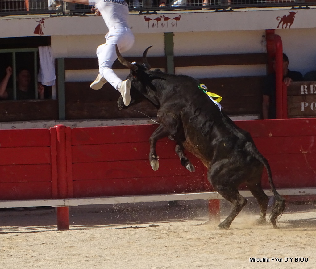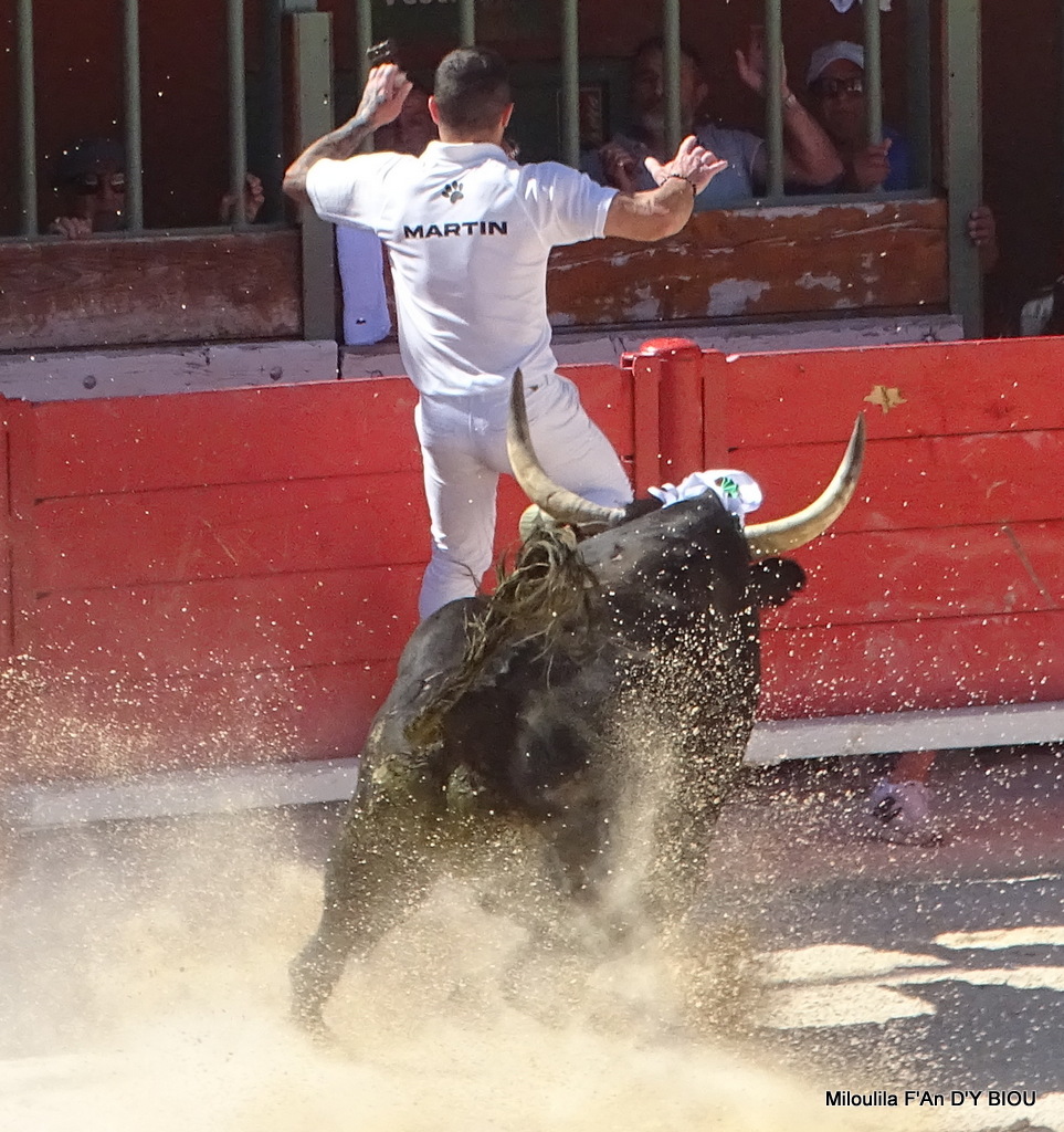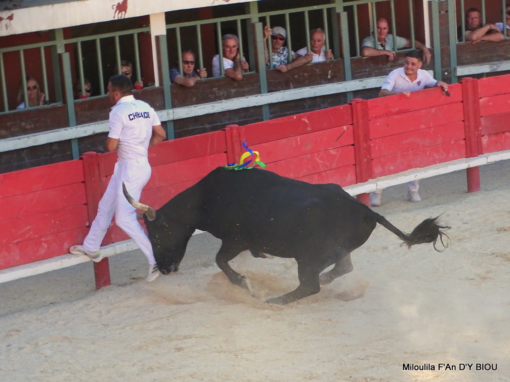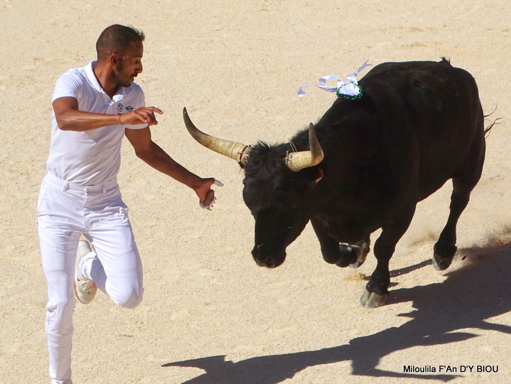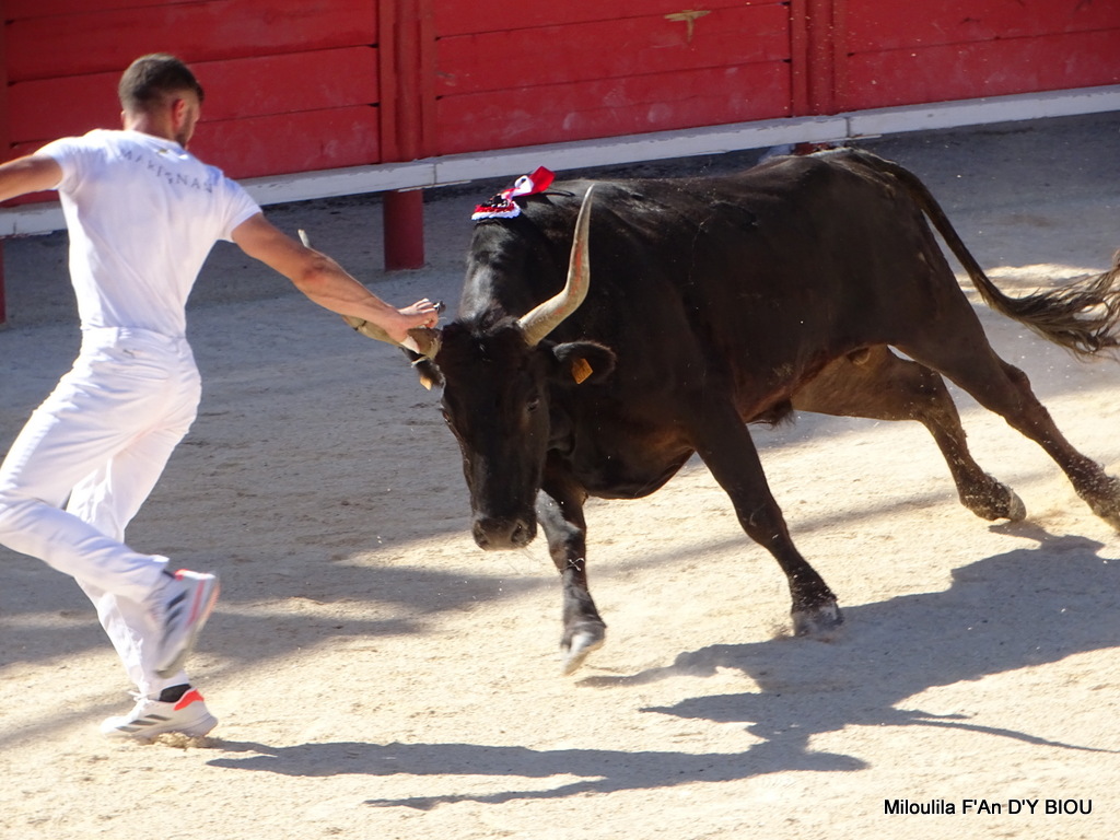 Cornes larges et évasées, elles offrent à qui veut venir les attributs. Bien sûr, il faudra tout de même essayer de les lui prendre. Car il saute bien le bougre. Sitôt sorti en contre piste pas besoin de portier pour le faire rentrer, Hop ! il est déjà dedans ! Tape et se soulève sur Chanat tout en musique ce qui accentue la bravoure des deux. Chekade est poursuivi. Il court vite Corté. Zekraoui au passage pour le gland et Chekade pour la coupe. Petit tour de contre-piste, comme un besoin de se défouler, pas de problème, il revient au plus vite en piste. Vicieux, saute après Chekade qui est en contre-piste, Chekade saute en piste, et sur le même temps, Corté revient en piste pendant que Chekade repart en contre-piste. Ah mais ! Chekade dans la mesure de faire briller, il occupe bien son temps avec Corté. Actions sur Marignan et Oukharti, il n’oublie pas de se soulever derrière eux . Lopez lui ramasse la première ficelle, la seconde va à Marignan. Rentre en musique. Par 5 fois, Carmen en piste. Moment tout autre qui détend l’atmosphère pour un taureau voltigeur.