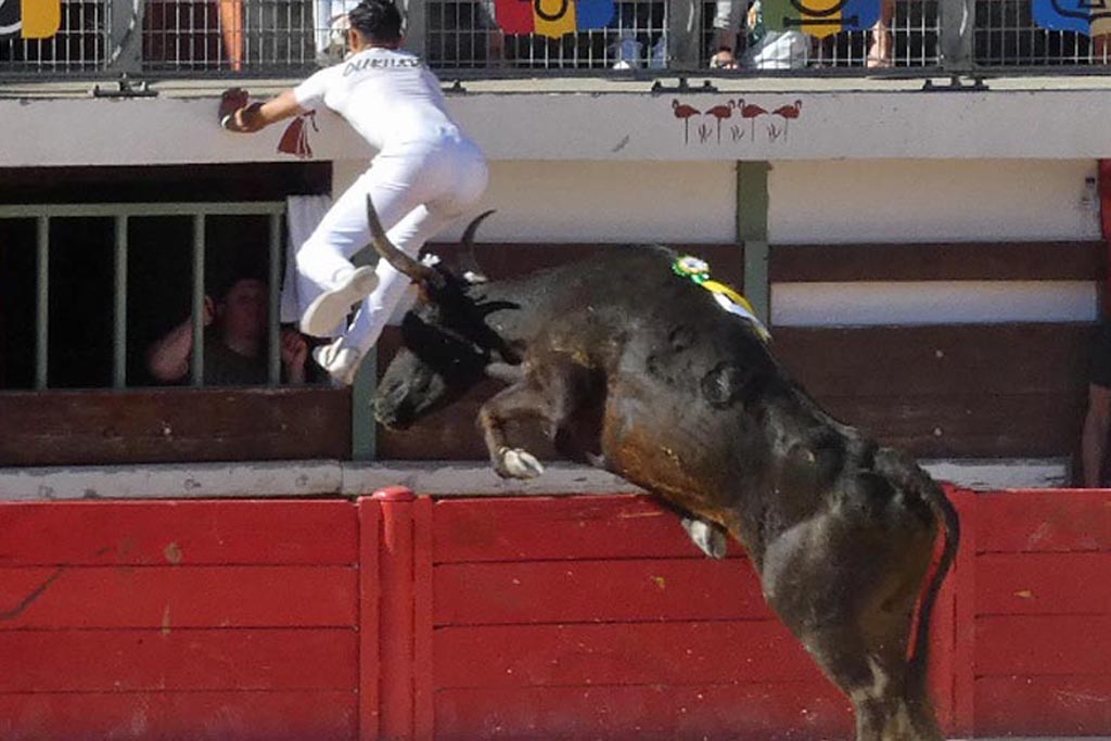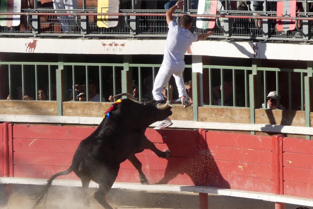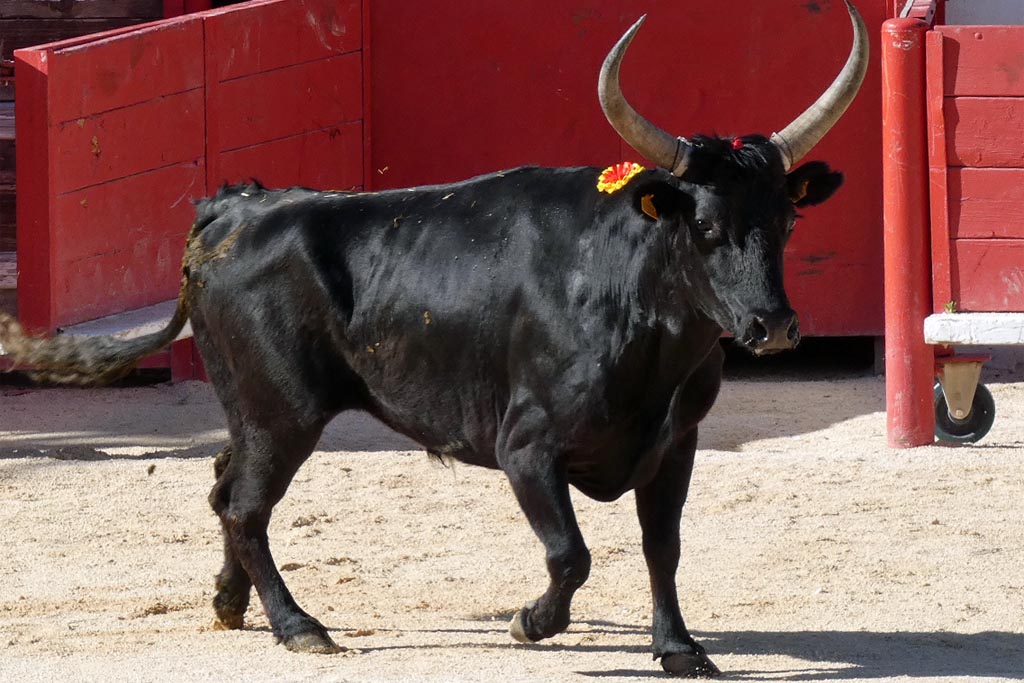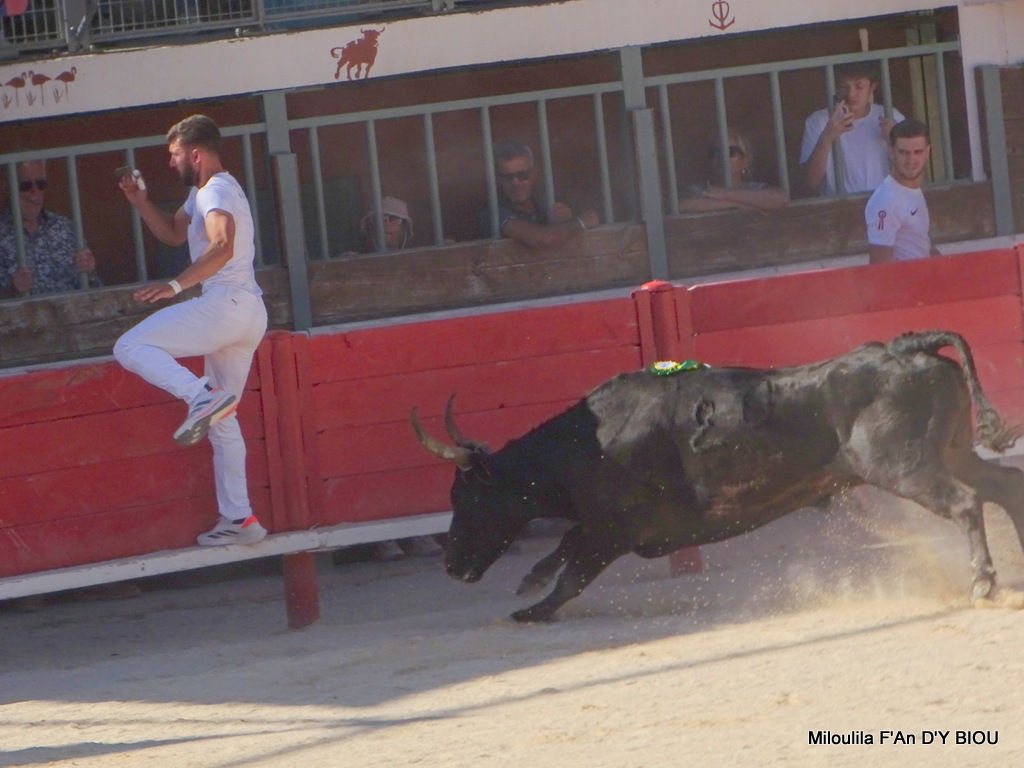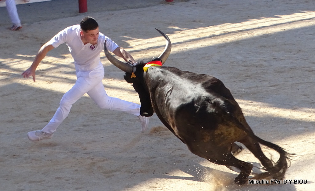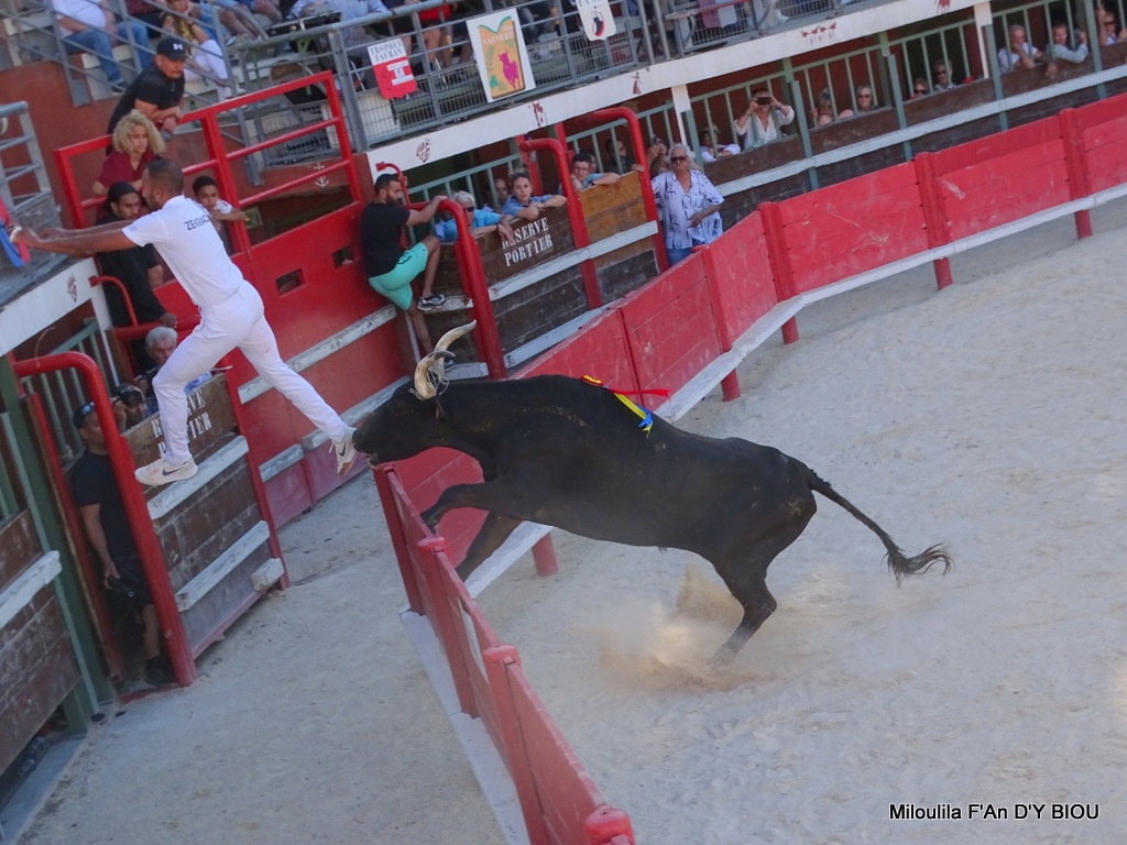 Cornes larges et évasées, elles offrent à qui veut venir les attributs. Bien sûr, il faudra tout de même essayer de les lui prendre. Car il saute bien le bougre. Sitôt sorti en contre piste pas besoin de portier pour le faire rentrer, Hop ! il est déjà dedans ! Tape et se soulève sur Chanat tout en musique ce qui accentue la bravoure des deux. Chekade est poursuivi. Il court vite Corté. Zekraoui au passage pour le gland et Chekade pour la coupe. Petit tour de contre-piste, comme un besoin de se défouler, pas de problème, il revient au plus vite en piste. Vicieux, saute après Chekade qui est en contre-piste, Chekade saute en piste, et sur le même temps, Corté revient en piste pendant que Chekade repart en contre-piste. Ah mais ! Chekade dans la mesure de faire briller, il occupe bien son temps avec Corté. Actions sur Marignan et Oukharti, il n’oublie pas de se soulever derrière eux . Lopez lui ramasse la première ficelle, la seconde va à Marignan. Rentre en musique. Par 5 fois, Carmen en piste. Moment tout autre qui détend l’atmosphère pour un taureau voltigeur.