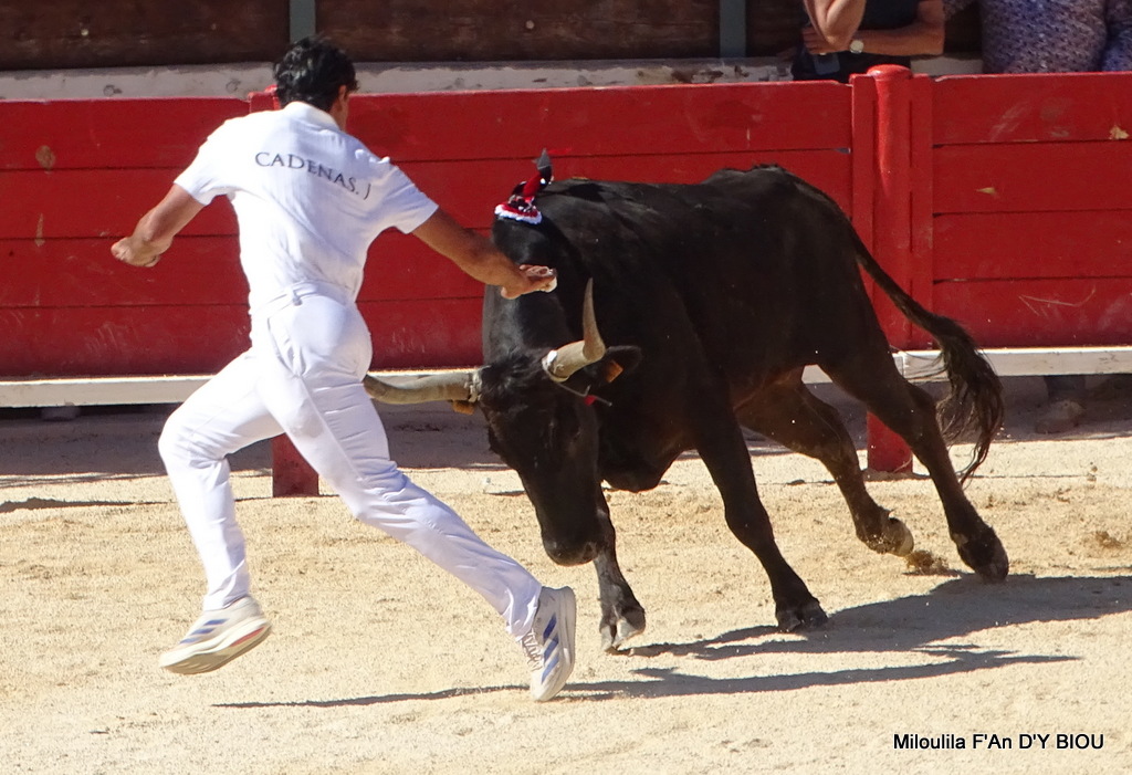 Chekade, en raseteur aguerri, s’offre, mais Craulen n’est pas dans l’accueil et tel un bolide fonce tête la première, en puissance et le fait basculer en contre piste ! Plus de peur que de mal mais c’était juste. Chanat prend la relève et coupe. Pas le temps de réfléchir, il faut y aller et Chekade veut sa revanche, alors il y retourne. Pour lui, cocarde et gland. C’est toujours ça de pris. Oukharti brille dans la série envoyée et Lopez glane au passage le deuxième gland. Aux ficelles, aux aguets, Craulen est prêt à tout pour les conserver. Donc il mène le jeu. Marignan dans la demande et série bien pensée et travaillée, enfin un travail en commun pour faire briller dans les reprises le taureau. Rentre ses ficelles, applaudi. Par 5 fois, Carmen en piste.