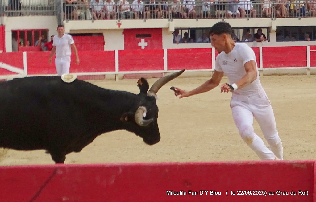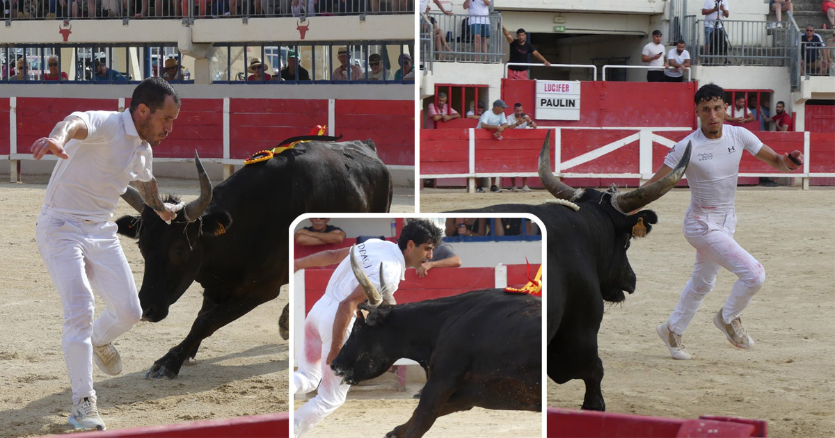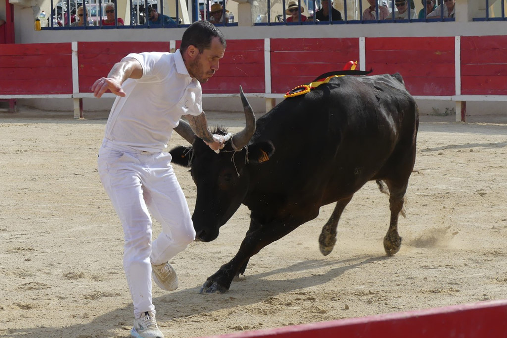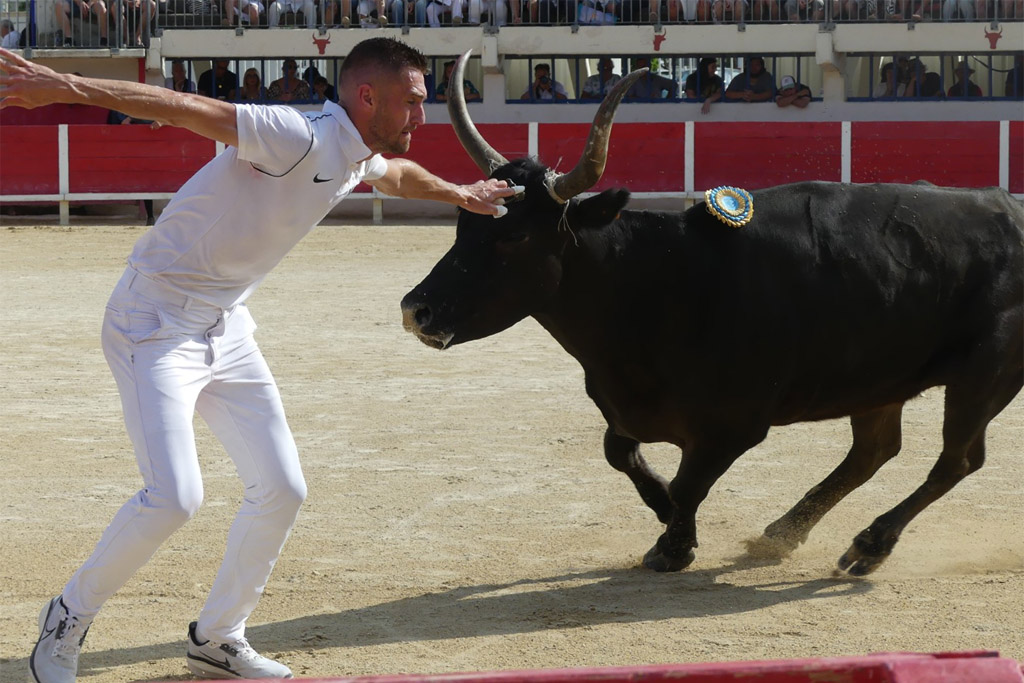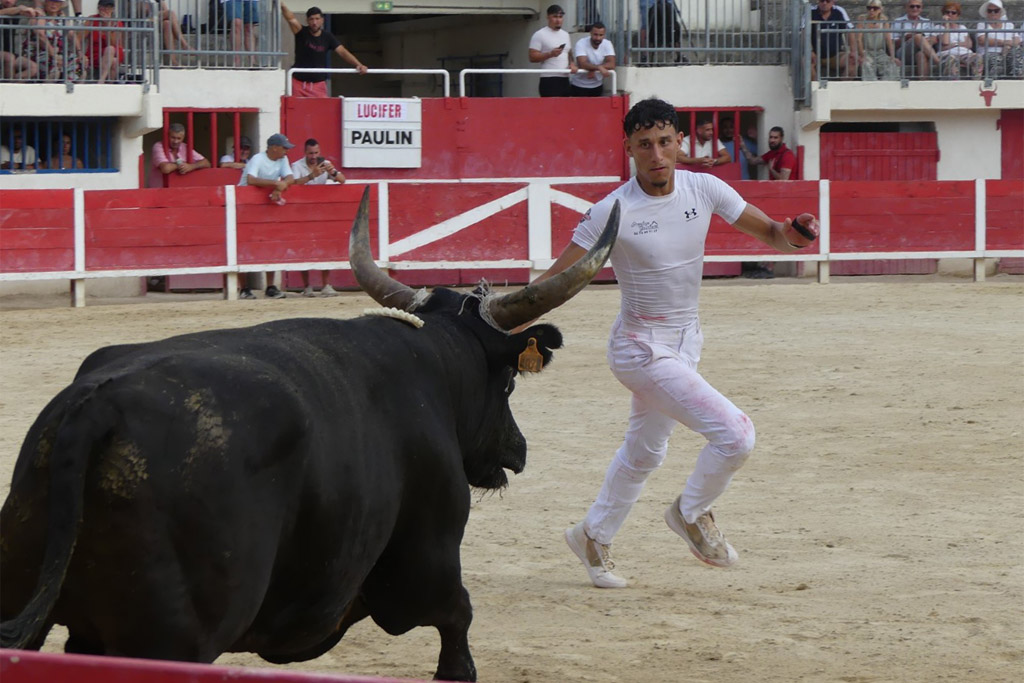 Aux ficelles, tout semble découler simplement, Le Sage s’offrant à la course et anticipant de façon sérieuse Cadenas qui se porte à lui, et il n’a pas trop de ses deux jambes pour arriver au plus vite à la planche salvatrice (Carmen). C’est parti pour une belle démonstration de savoir des hommes et du taureau. Zekraoui, Naïm, Cadenas, Martin, Oukharti… Chacun dans leur savoir, démonstration et tout en réponse de Le Sage qui démontre combativité, générosité. Volontaire, il prend tout, donne tout, reçoit, démontre, démonte. Les ficelles pendouillent ; ça l’a joue dure. Les hommes n’ont de cesse de la fragiliser et c’est Martin qui prend de court tout le monde et la ramasse. À la deuxième, rebelote, les hommes repartent pour un tour, Le Sage dans des réponses sérieuses qui enclenchent une bataille entre les hommes pour la prise. Le disque résonne, tant la charge accompagne la demande. À moi, à toi, à nous, à qui, à Martin, la deuxième ficelle. Volontaire, généreux, il offre une très belle prestation.