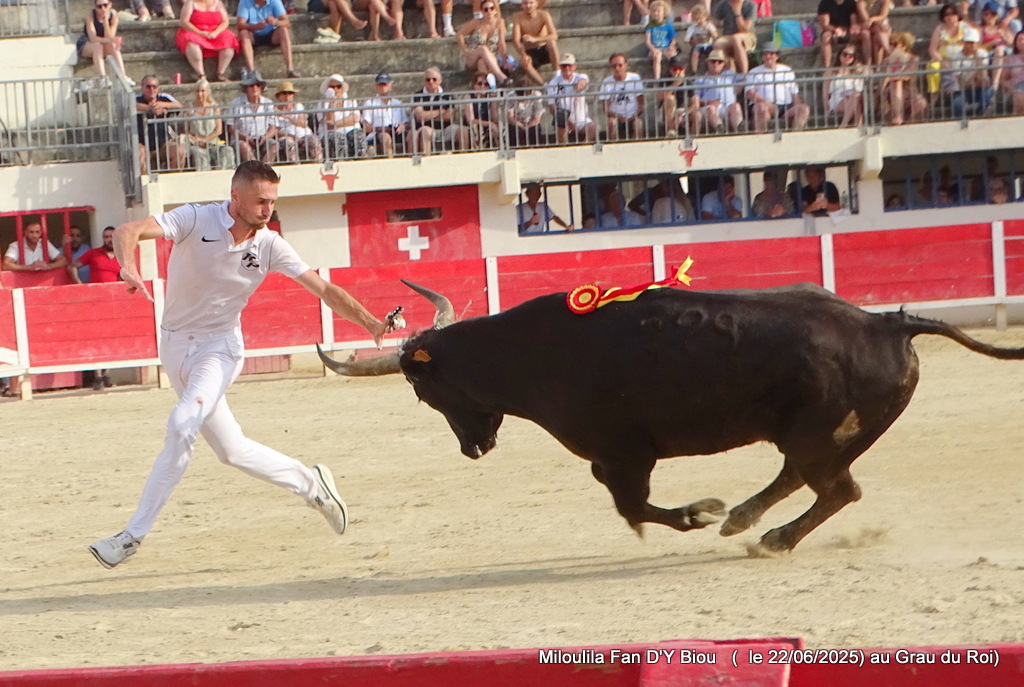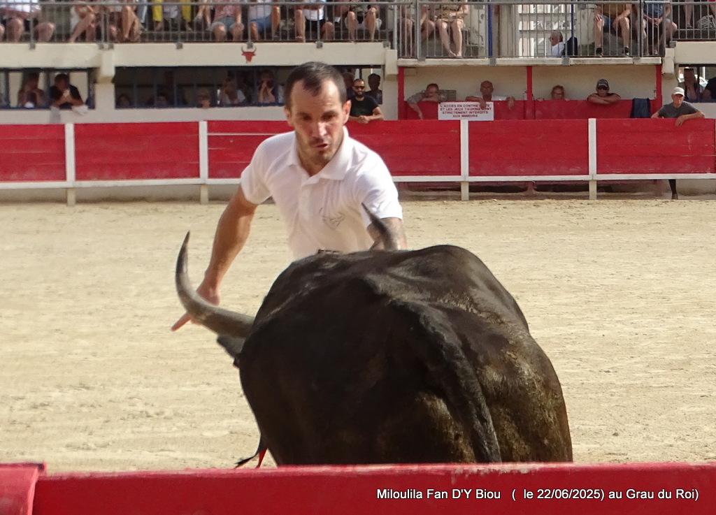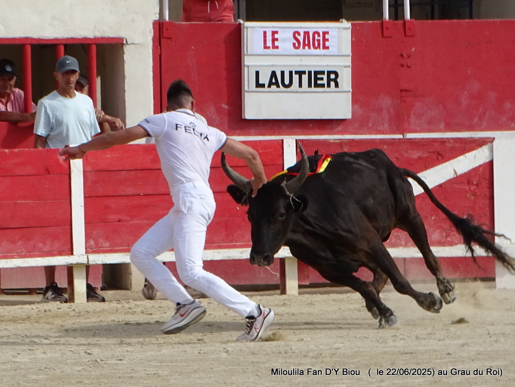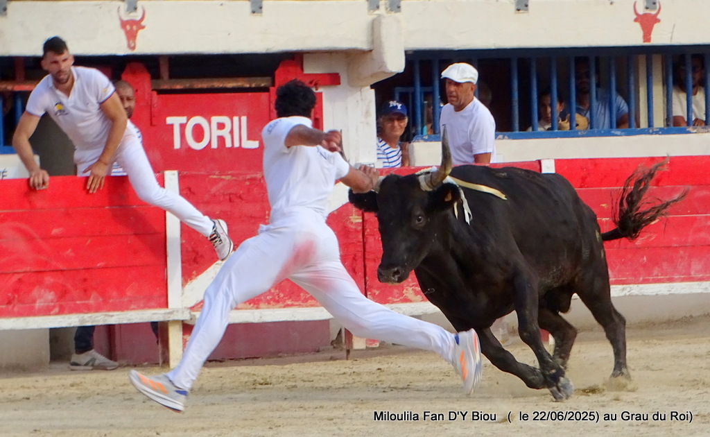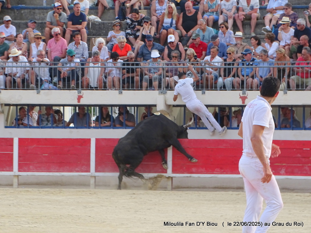 Aux ficelles, tout semble découler simplement, Le Sage s’offrant à la course et anticipant de façon sérieuse Cadenas qui se porte à lui, et il n’a pas trop de ses deux jambes pour arriver au plus vite à la planche salvatrice (Carmen). C’est parti pour une belle démonstration de savoir des hommes et du taureau. Zekraoui, Naïm, Cadenas, Martin, Oukharti… Chacun dans leur savoir, démonstration et tout en réponse de Le Sage qui démontre combativité, générosité. Volontaire, il prend tout, donne tout, reçoit, démontre, démonte. Les ficelles pendouillent ; ça l’a joue dure. Les hommes n’ont de cesse de la fragiliser et c’est Martin qui prend de court tout le monde et la ramasse. À la deuxième, rebelote, les hommes repartent pour un tour, Le Sage dans des réponses sérieuses qui enclenchent une bataille entre les hommes pour la prise. Le disque résonne, tant la charge accompagne la demande. À moi, à toi, à nous, à qui, à Martin, la deuxième ficelle. Volontaire, généreux, il offre une très belle prestation.