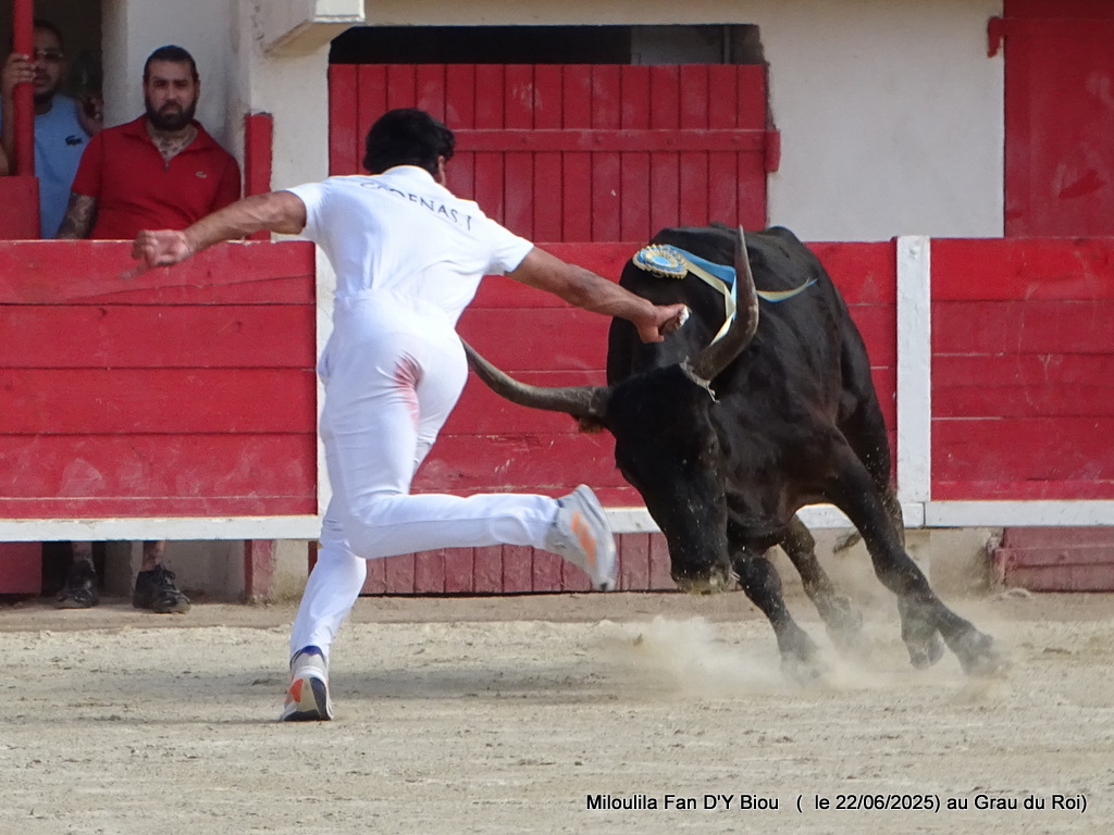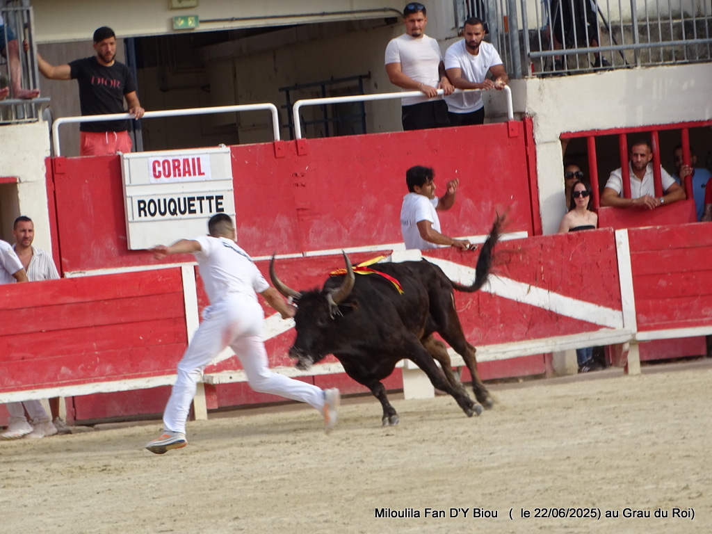 D’emblée, il chasse, se cale et commence à analyser son jeu, qui est qui, qui fait quoi ! Série en musique, Félix en profite pour la coupe, Cadenas le gland, Zekraoui entend résonner Carmen et deuxième gland pour lui avant que Martin ne termine les attributs par la prise de la cocarde. Choses sérieuses, il est parti pour les ficelles, et c’est en détermination et puissance qu’il s’investit dans ce travail. D’abord, anticiper Assenat, ce n’est qu’un essai, très belle et énorme anticipation sur Cadenas qui se replie au plus vite jusqu’à la barrière… de Corail… Les rouleaux s’abattent, Assenat, Oukharti, Cadenas, une série, Cadenas, encore, dans des rasets qui portent et brillent et fait briller, mais la barrière résiste à l’érosion et c’est avec bravoure, courage que Corail prend, combat, rejette l’homme sur l’air de Carmen. Un festival de très belles réponses, se soulève derrière Oukharti et ce par deux fois. Comment ne pas être en ravissement face à un taureau de cette envergure ? Oukharti fait la première ficelle, à la seconde, on prend les mêmes et on recommence. Naïm, Cadenas, encore et toujours, série qui démontre la pleine implication de Corail et Zekraoui qui lui glane au passage la deuxième ficelle. Retour sous l’air de Carmen et le disque entendu 13 fois en piste. Beau moment, de bonheur face à un taureau qui en veut, qui en gagne, qui démontre une belle capacité à se défendre. Volontaire, courageux, généreux, il a tout du grand, il lui reste maintenant à se peaufiner dans une belle maturité.