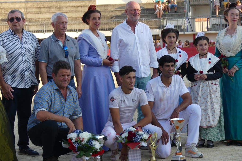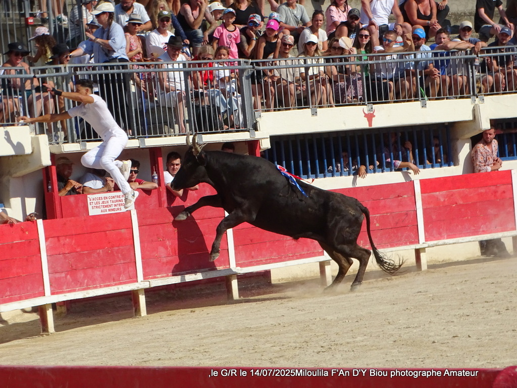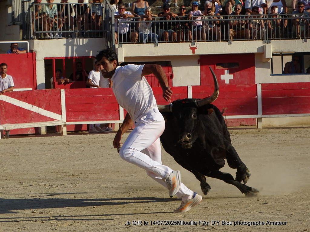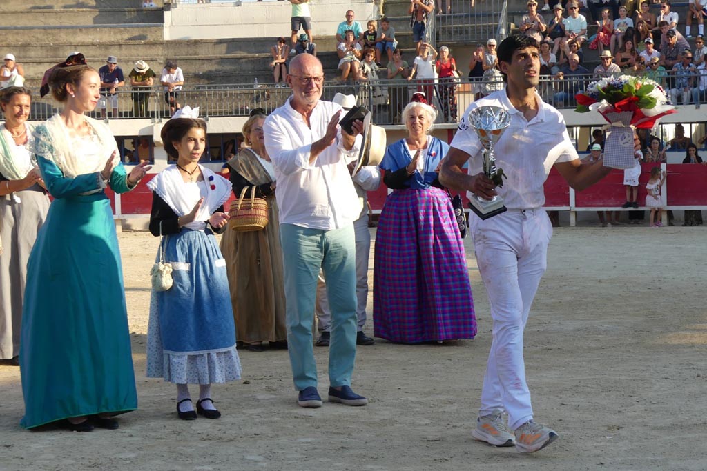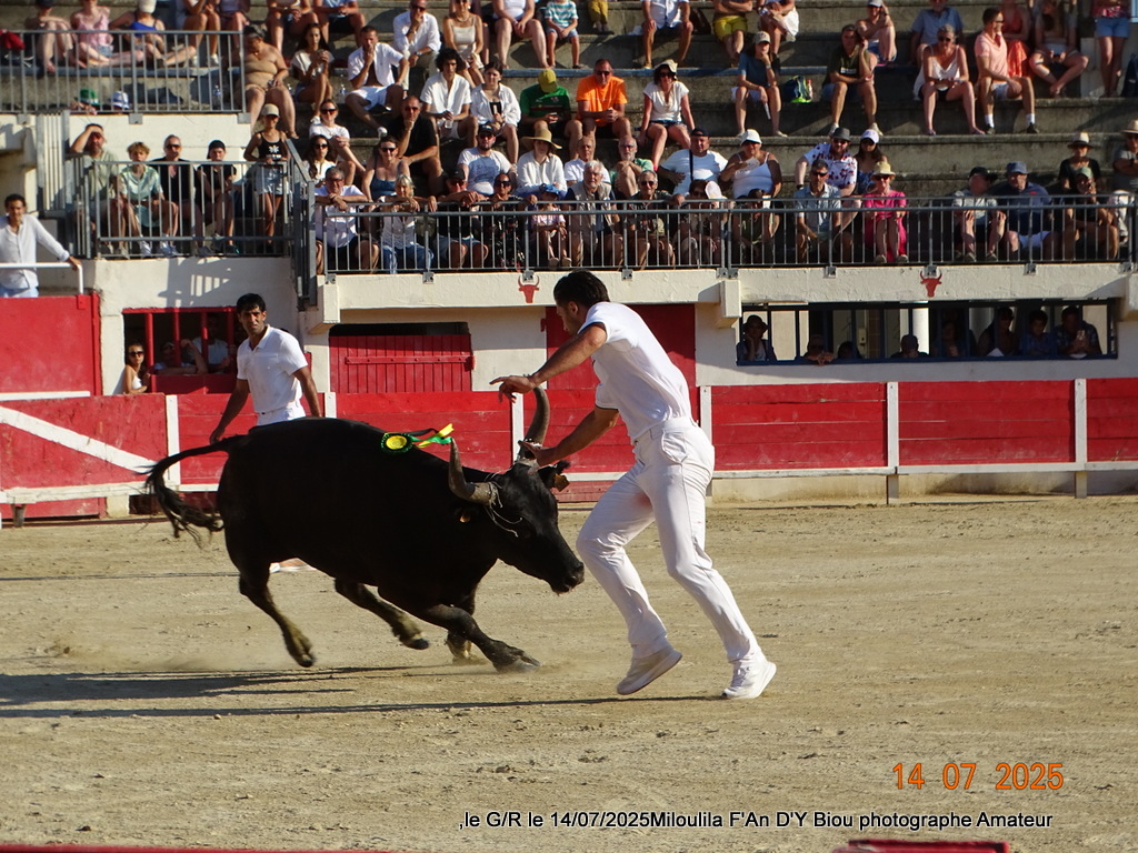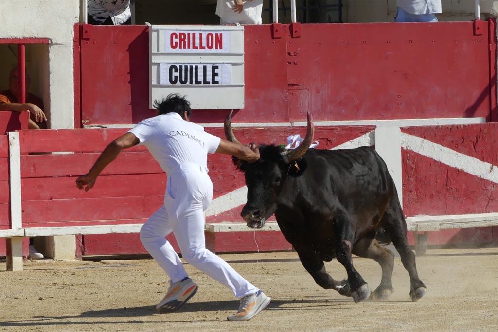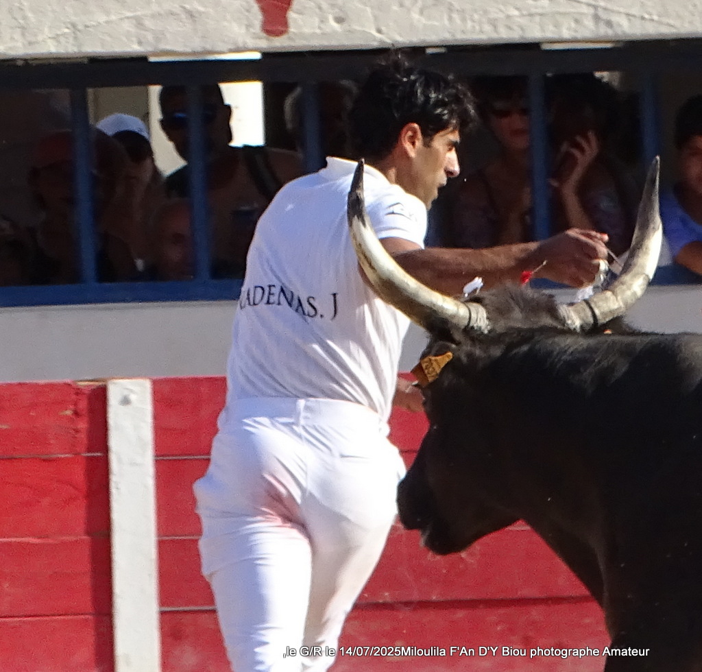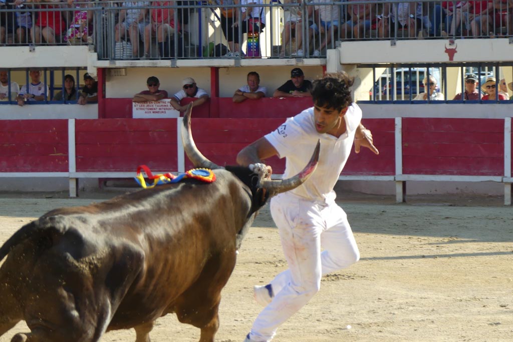À la deuxième, Perolen, trouve ses placements, répond présent à chaque demande. Cadenas repart à la coupe, il en veut, il travaille, il assure. Généreux, Perolen prend tous les rasets. Oukharti, Cadenas, Charrade s’engagent, les réponses fusent, et les ficelles s’effilochent. La musique retentit, les actions sont belles, soutenues. Perolen montre sa désapprobation face à Cadenas en soulevant les planches derrière lui. Faut pas trop le chatouiller ! Et là, comment décrire le travail d’un homme face à une bête qui résiste si bien, que les rasets demandés, emportent l’adhésion du public. Une fois, deux fois, jusqu’aux planches sur l’air de Carmen. Coupe tant et plus de Cadenas, qui vient, qui revient encore et encore, il reste deux bouts. Là, la ficelle fait de l’œil aux raseteurs qui s’engouffrent dans la ruée, Mais si Perolen résiste, Cadenas aussi. Comment peut- il perdre ce qu’il a chèrement travaillé ? Le public le soutient tant sa prestation est à couper le souffle, il faut, il doit l’avoir cette ficelle ; Il passe, repasse… C’est juste beau ; il la mérite, chacun retient son souffle, et enfin quand il brandit ses deux derniers brins, le public l’ovationne. C’est du beau, du grand travail. Il est allé la chercher cette ficelle ! À ne pas oublier ce moment. Perolen a brillé lui aussi par sa résistance et son engagement face à un raseteur émérite. Retour en musique et 6 fois Carmen en piste.