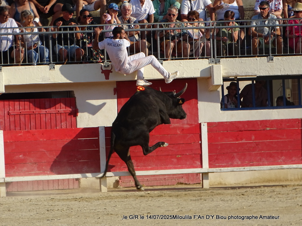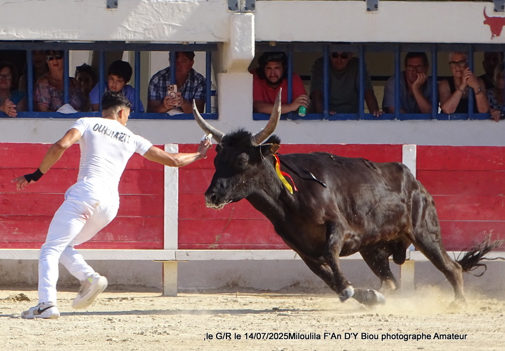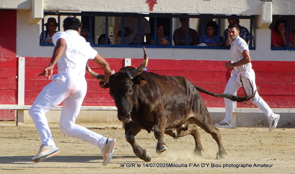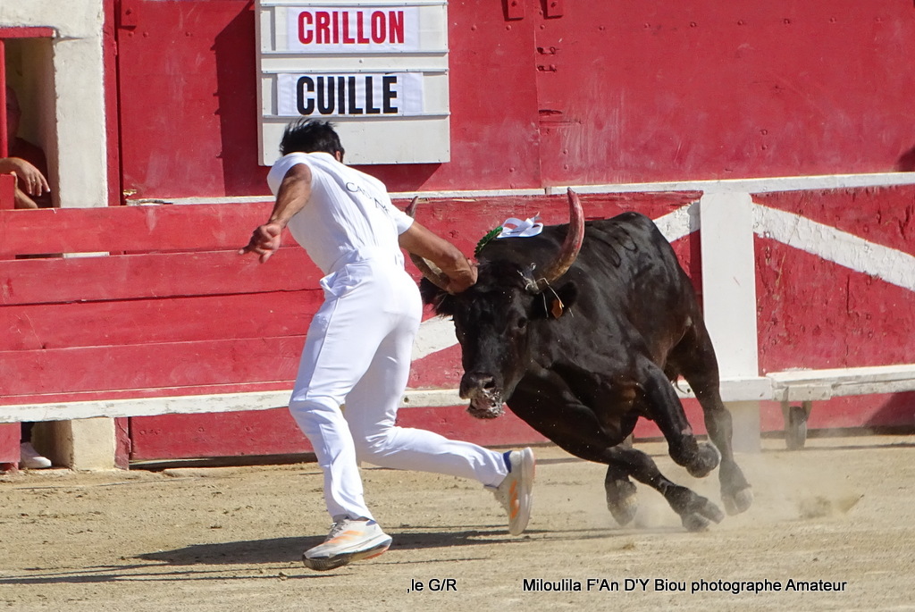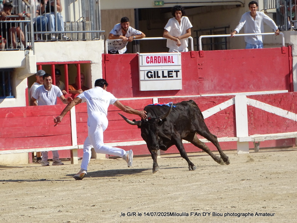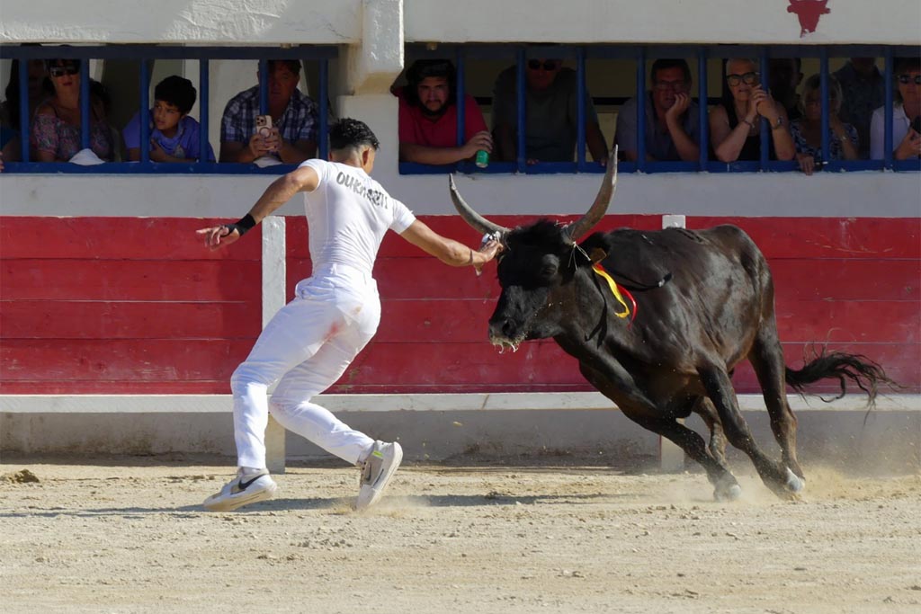 Vite ramassés les premiers attributs par Cadenas pour la coupe, Oukharti pour la cocarde, Zekraoui et Naïm pour les glands. Aux ficelles, Figari se soulève derrière Charrade, anticipe la demande et met en garde l’homme. Cadenas dans le jeu, Naïm voit se soulever Figari derrière lui à l’arrivée aux planches et tant qu’à faire il les dégonde. Les hommes rentrent dans la danse et en maitre de piste, Figari donne le La. Cadenas à son habitude part à la sape, la ficelle en prend un coup, encore Cadenas sur l’air de Carmen continue son jeu, belle action toute en force. Passage de Oukharti, main levée mais Cadenas arrivé juste derrière lui, lève la main pour la ficelle. Attribuée à Cadenas par le Président de course, Cadenas en piste remet à Oukharti la prise. Un beau geste, pas très courant, pas courant du tout ! C’est montrer sa valeur de combattant. Rentre sa deuxième et entend 2 fois l’air de Bizet en piste.