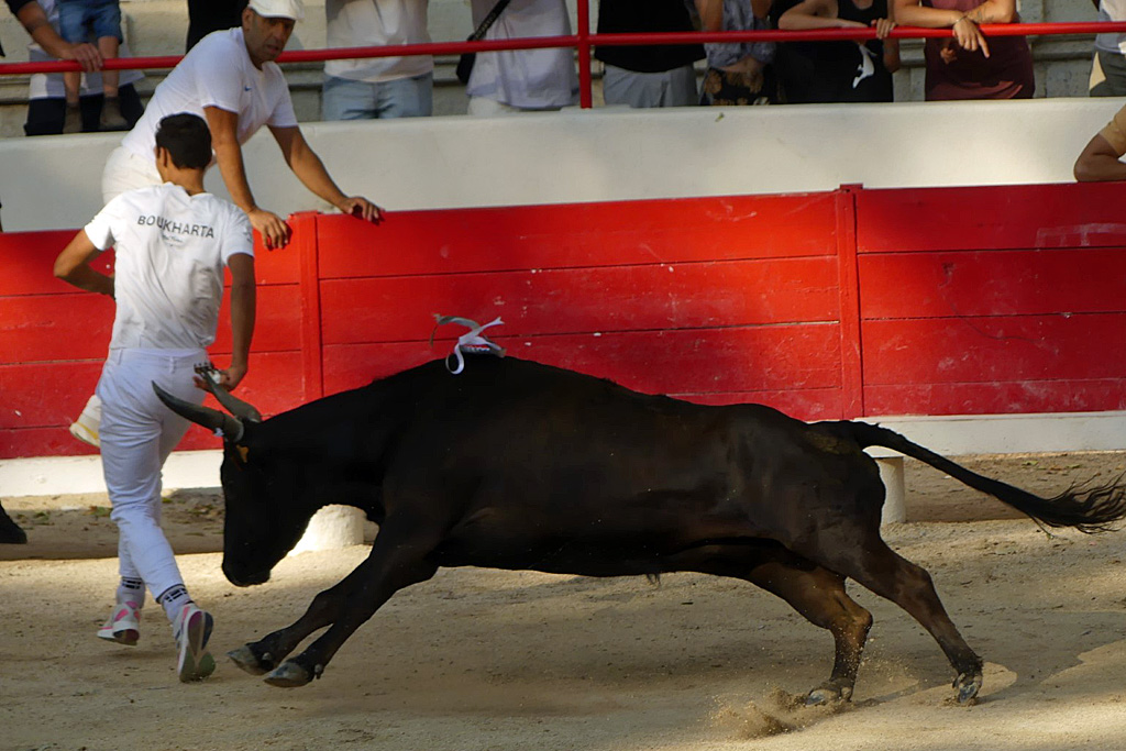 Il fait le vide en piste, avant de se faire enlever les premiers attributs : coupe pour Lopez, cocarde pour Marignan, premier gland pour Chekade. Le deuxième gland est à pourvoir et c’est Zekraoui qui se l’octroie. Place aux ficelles. Il se cale, regarde autour de lui, un geste, il anticipe Benhammou qui se porte à lui, obligé de se replier. Deuxième demande, deuxième réponse tout aussi forte. Se cale, et là, fort de sa garde, il épie chaque mouvement. Il tient alors les hommes en respect, tête bien droite comme en défi. Qui essaie de venir à lui est vite vu et Martinez en fait les frais. Il est attentif à tout ce qui bouge, d’où une certaine réserve des hommes. Boukharta relève le défi et c’est une magnifique réponse toute en force et puissance qui se joue derrière lui en musique. Marignan, s’engage aussi, et la réponse est franche, directe, soutenue. Boukharta à nouveau en mode ramasse ficelle, mais s’il passe, il sent le mourre au plus prés de lui et Carmen résonne. Il domine. La prime monte, 500 € pour encourager les hommes face à un taureau plein de bravoure. Mais que nenni, personne ne passe d’où bronca du public, car il faut pouvoir honorer un taureau de cette valeur. Rentre ses ficelles ; 5 fois Carmen entendu en piste.