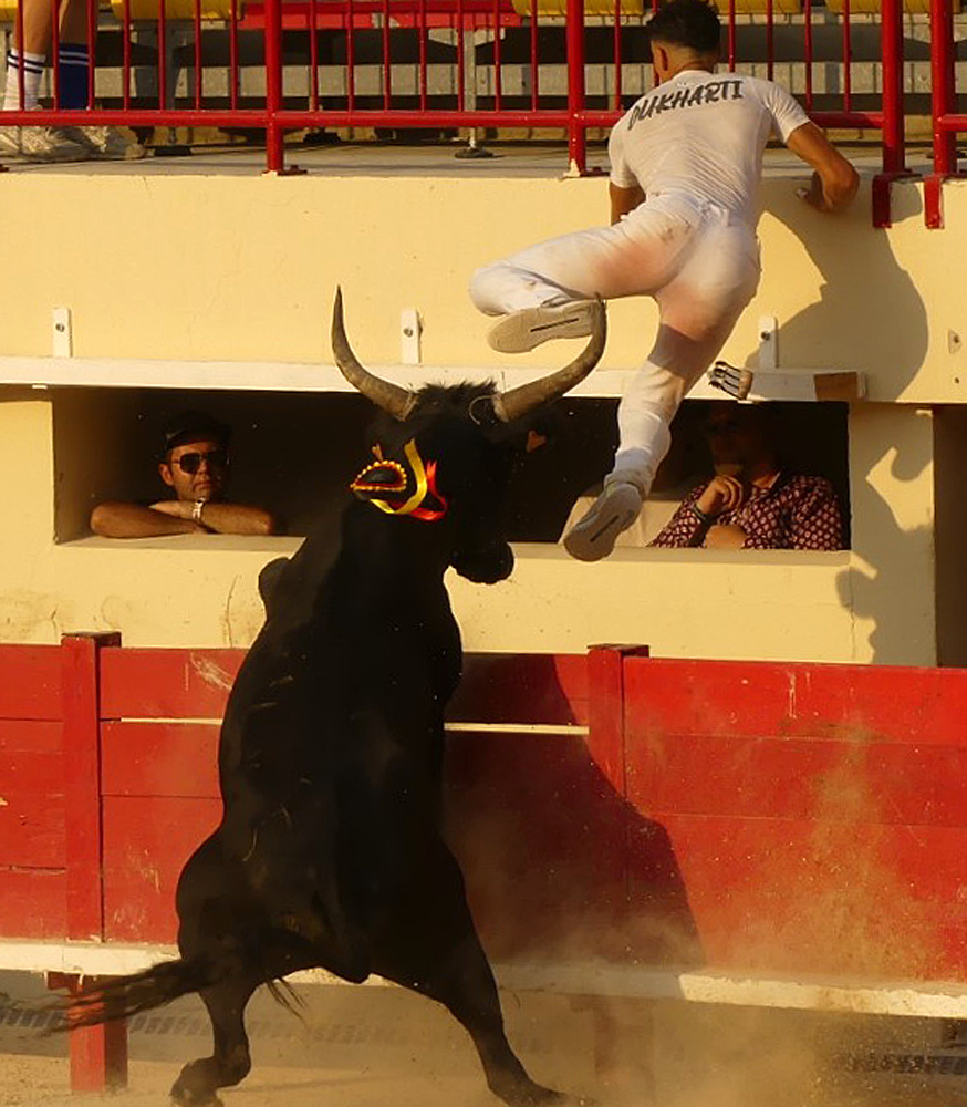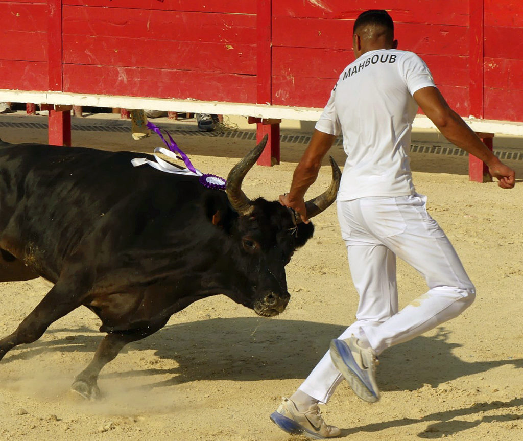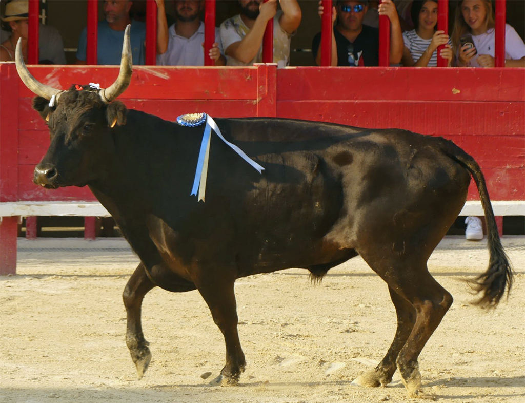 Une poussée forte pour la recherche des premiers attributs. Lou Poutoun répond avec détermination comme sur Oukharti et Cadenas venus le chercher. À Chekade, la coupe, la cocarde pour Oukharti et les glands pour Oukharti et Naïm. Aux ficelles, chasse avec vigueur l’homme venu les titiller. Lou Poutoun anticipe et dégage avec puissance jusqu’aux planches. El Mahboub dans la demande, le Biòu dans la réponse et tous deux en grand élan jusqu’à l’arrivée aux planches. Le tout en musique. À El Mahboub, la première ficelle. À la deuxième, El Mahboub n’hésite pas à se confronter à lui malgré un brin de méchanceté qu’il montre lors du raset. Lou Poutoun se soulève sous la puissance de son élan derrière El Mahboub (musique). Retour en musique et 3 fois Carmen en piste. Combatif, déterminé, un rien coléreux, anticipateur ; Lou Poutoun a un très bon répondant.