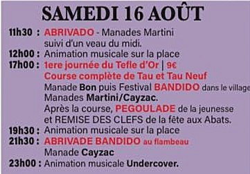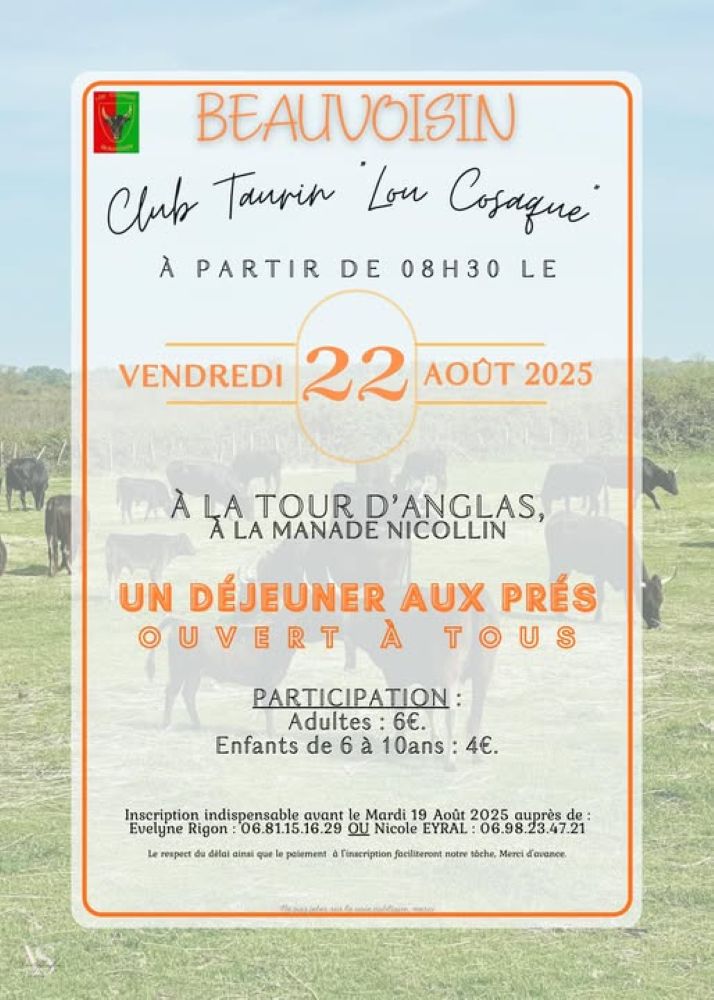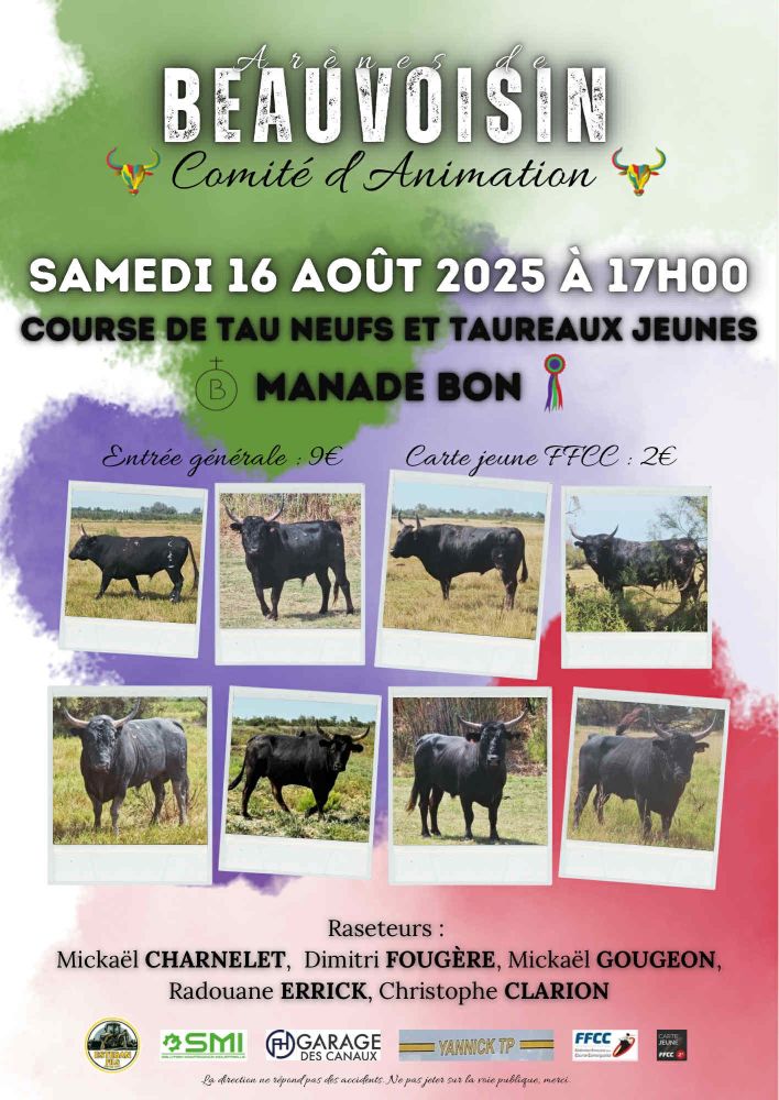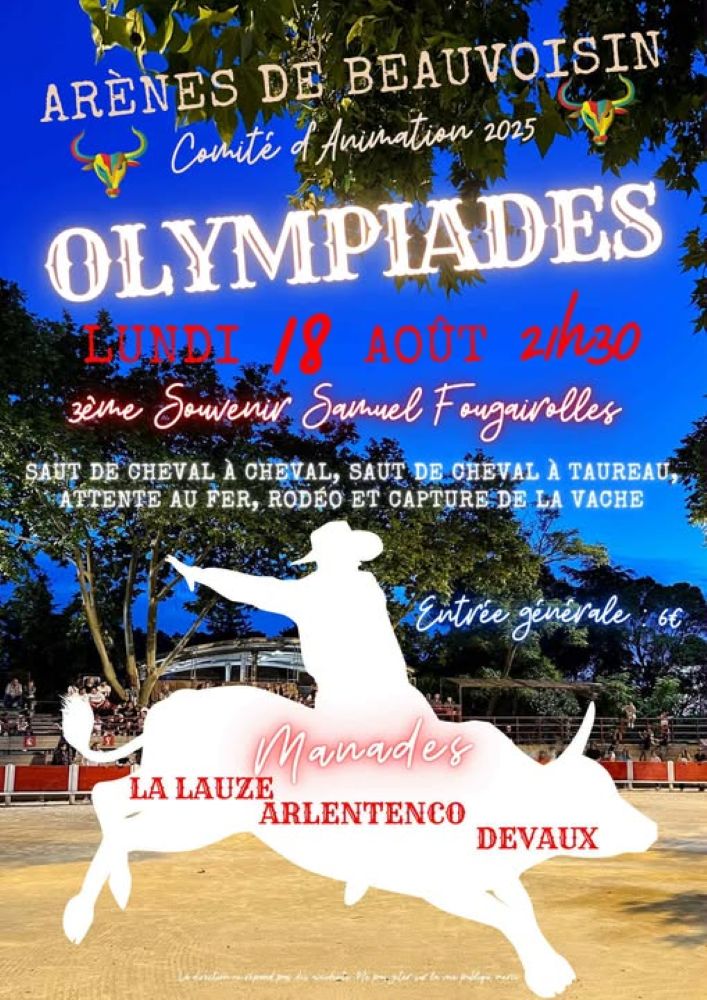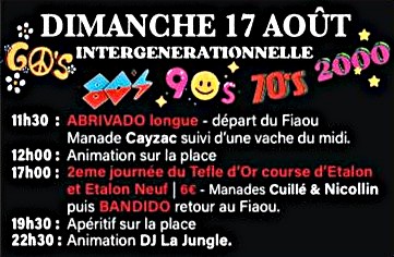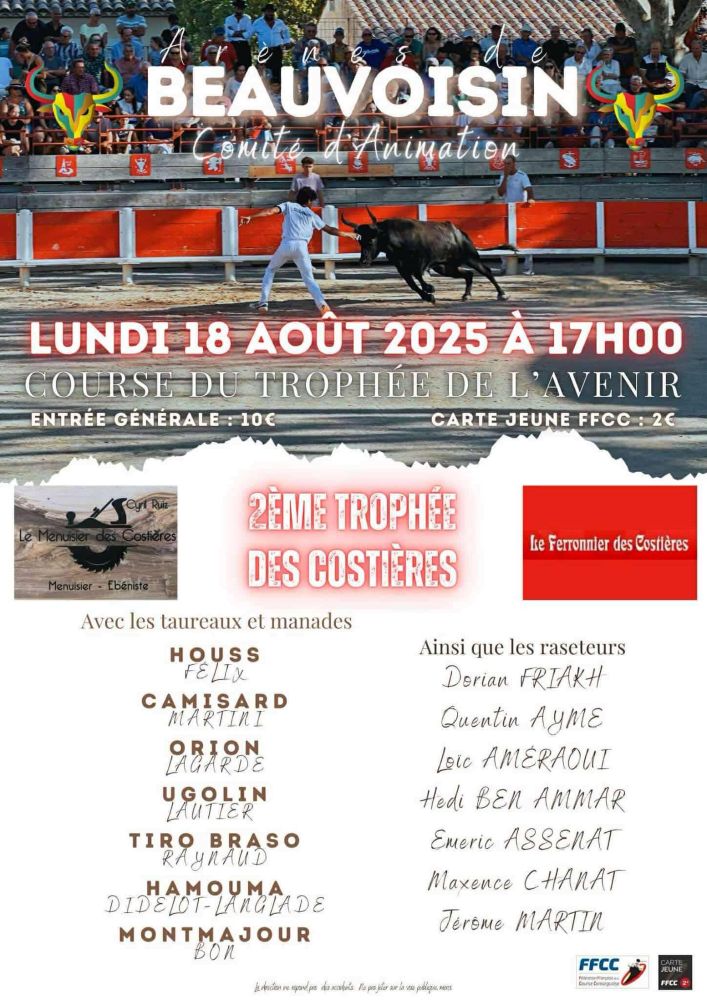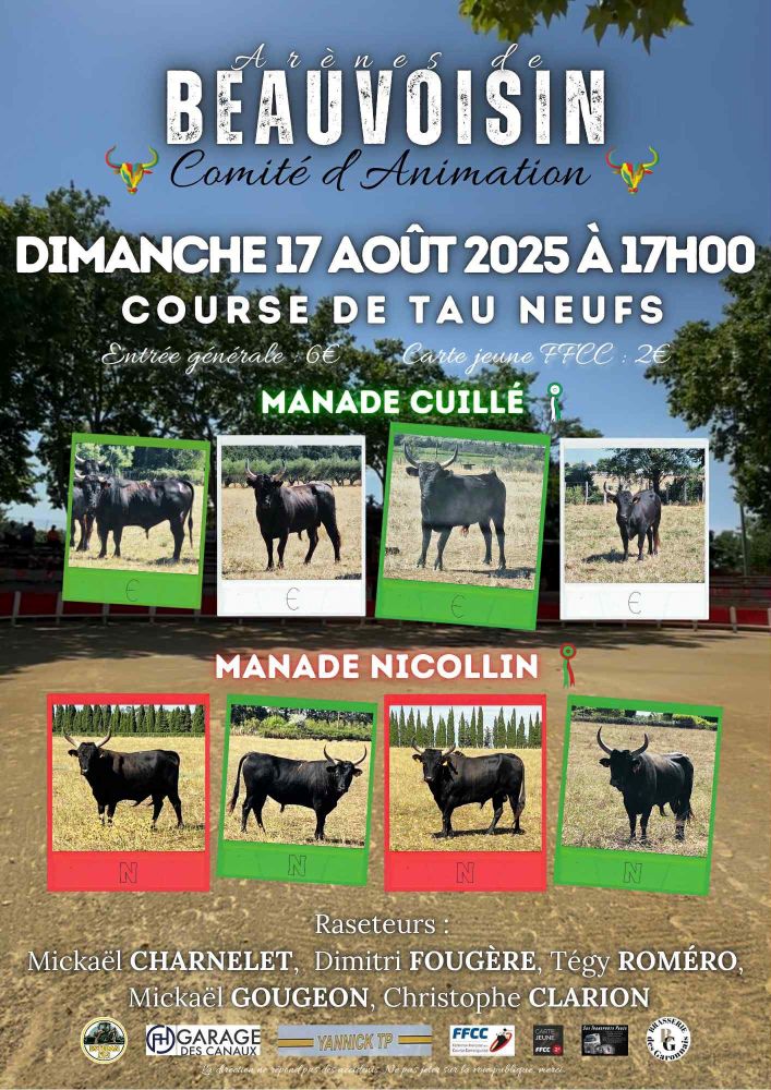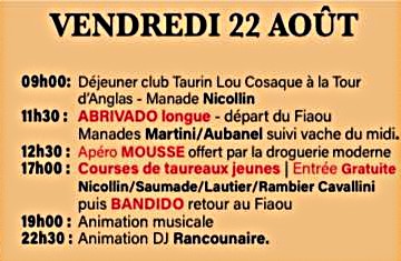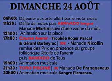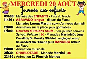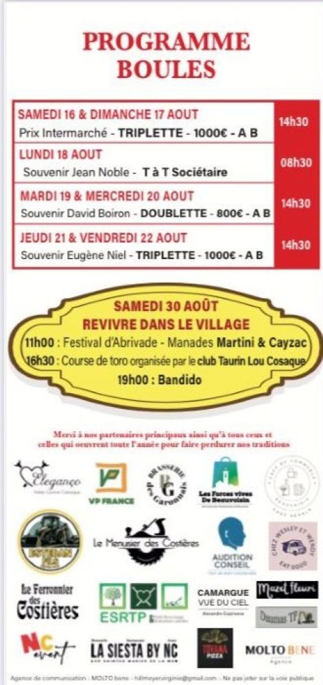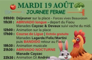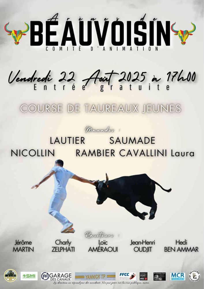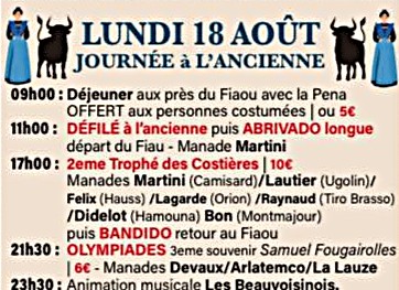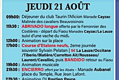 Un programme de 9 jours de festivités élaboré avec soin par le Comité d’animation de Beauvoisin, déjeuners aux prés, abrivado, bandido, courses camarguaises, courses de nuit, journée à l’ancienne, olympiades, animations musicales … un moment de partage à vivre en famille ou entre amis.
