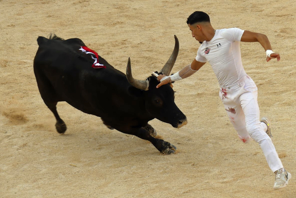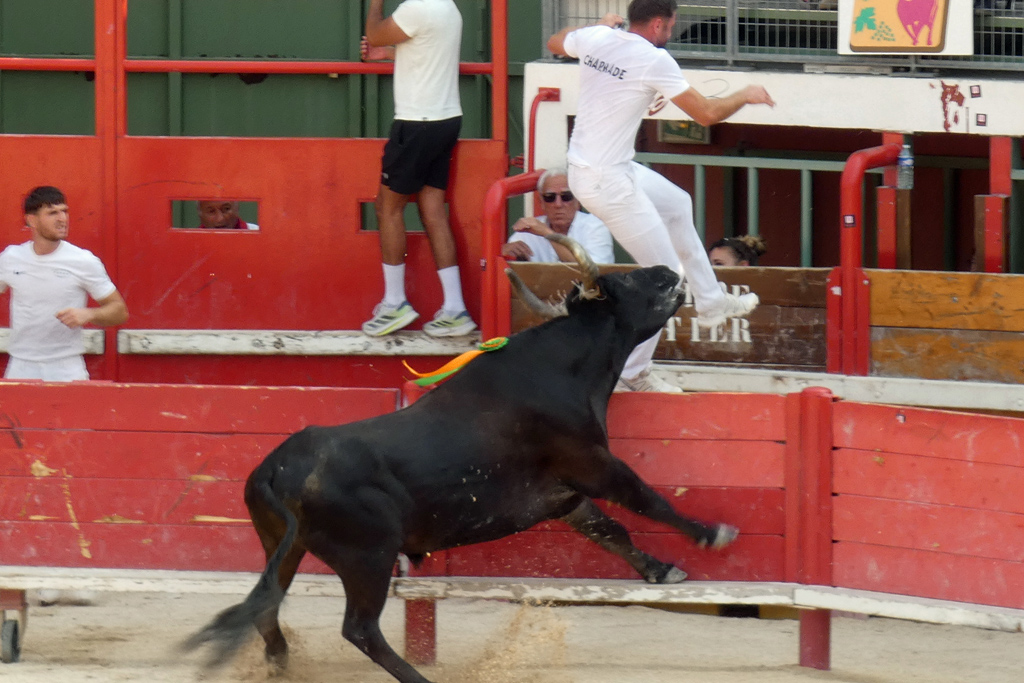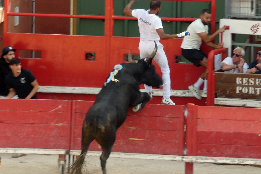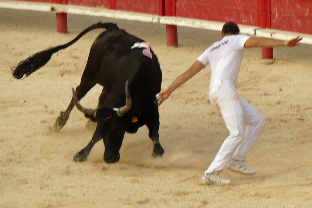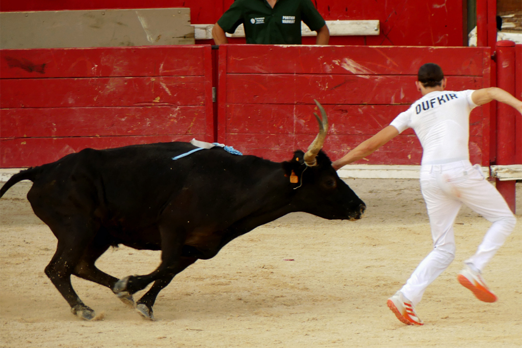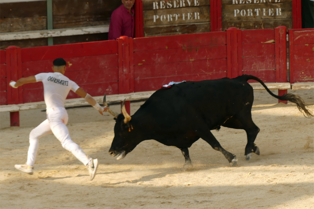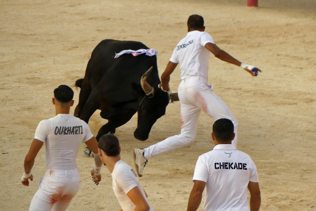 Il effectue sa dernière course dans les arènes de Vauvert car il prend ses quartiers de retraite. Zekraoui, part à la demande et la réponse est pressente et présente ; le tout en musique. Tom Charrade pour la coupe, Zekraoui, la cocarde ; Chekade et Oukharti pour les glands. Aux ficelles, Il se cale et attend, Oufkir dans la demande / réponse tout en efficacité sur l’air de Carmen. Puis Oukharti s’engage, et bel engagement. Par 4 fois, il le sollicite, par 4 fois, la réponse fuse, par 4 fois, les voilà partis tous deux à la barrière, au plus fort de l’action sur l’air de Carmen. Beaux moments. Anticipation sur Lopez qui ne démérite pas, main sur le frontal essaie tant bien que mal de ralentir la charge d’Artaban. La ficelle, pendouille, les hommes passent, Lopez en mode ramassage.