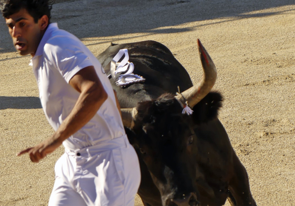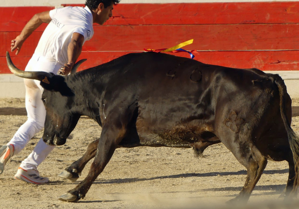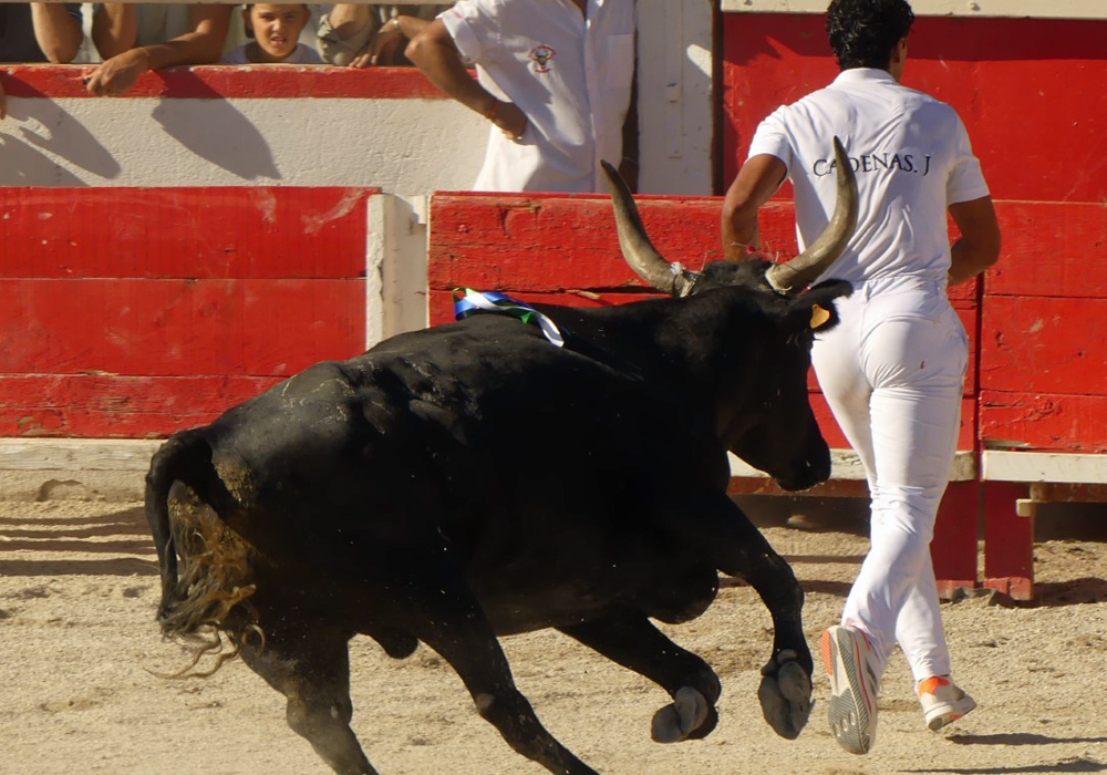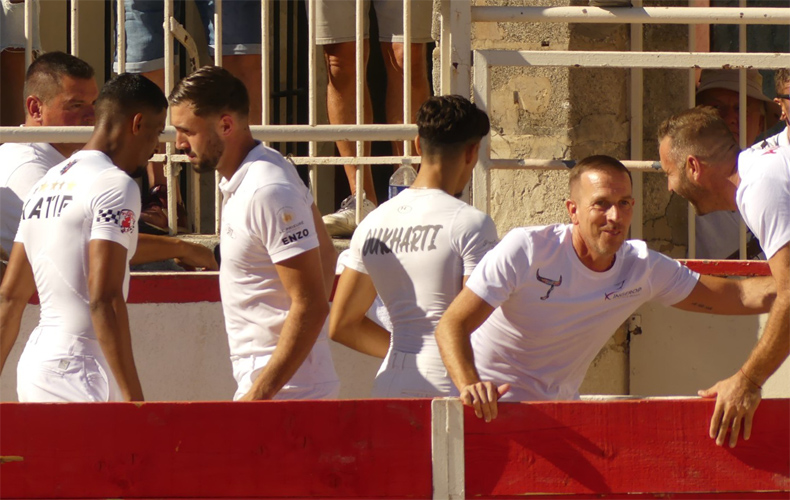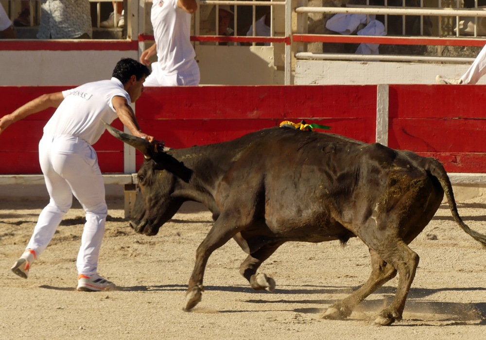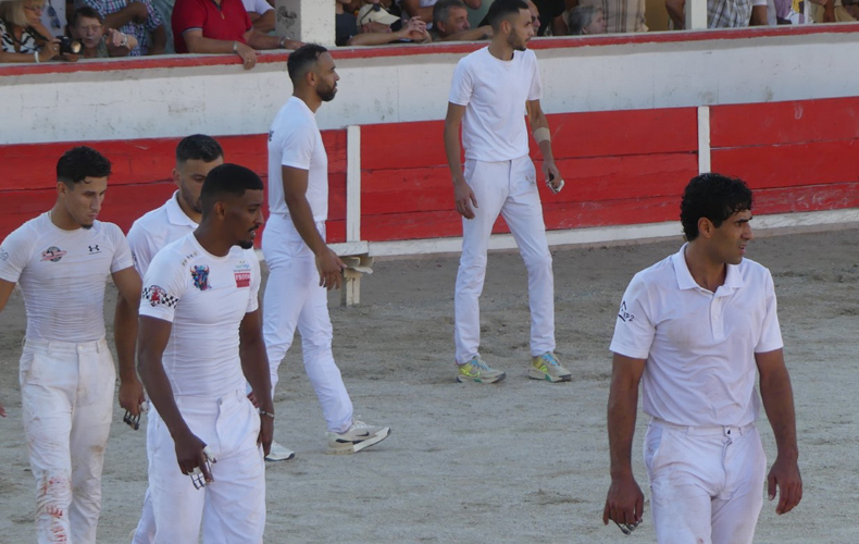 C’est une compétition, et les raseteurs la jouent serrée. D’où une approche rapide et plus qu’efficace car les premiers attributs tombent avec rapidité. Coupe pour Lopez, cocarde pour Cadenas, glands pour Lopez. Aux ficelles Cadenas part à la sape, une série se fait et la ficelle part en vrille. Naïm a le chic pour se faire serré au plus prêt, action soutenue de Pastour qui le renvoie dans les barres en musique. De rage, dégonde les planches. Ficelle bouillue, ficelle foutue et dans le crochet de Oukharti. À la deuxième, le taureau se cale mais observe l’adversaire, encore Naïm dans sa ligne de mire et le renvoie en musique, puis démontre encore par le dégondage des planches son mécontentement. Chekade subit le même sort, la réponse est déterminante, tout un travail se fait et Lopez dans la prise de la seconde ficelle.