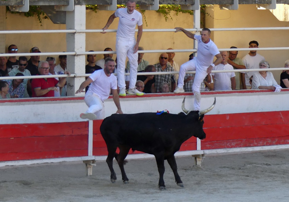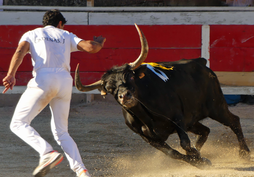 Rapidement, vite faits ses attributs malgré sa détermination à chasser. Cadenas pour la coupe, Naïm pour la cocarde et Cadenas et Charrade pour les glands. Aux ficelles, voilà partis les hommes dans le démarmaillage, surtout Cadenas qui s’investit au plus. Traversée puissance 10 pour couper, taureau derrière lui et finition complète. Cardinal saute en toute sérénité derrière Laurier, Charrade en fait les frais aussi, et musique pour agrémenter ces actions. Reprise de Cadenas, toujours à la pointe du raset, Oukharti à sa suite est obligé de se percher sur le tranchant du portail, le taureau venu à ses trousses essaie de le choper. Serré il a été ! Cadenas repart à la sape, cela lui importe la coupe, c’est le Sapeur ! Attention tout de même, Cardinal n’est pas prêt de se laisser faire, et sur un saut avec Cardinal à ses trousses, celui-ci manque lui « embrocher la jambe ». Cadenas la veut cette ficelle. Et, quand il veut, il peut ! Il passe, l’appelle, le regarde, main sur la corne, il arrache haut la main la ficelle. L’action a été si belle, que le public l’ovationne. Cadenas rayonne face à une si belle prise. Il a, par là, démontré ce qu’est une belle prise et sur un travail suivi. À la deuxième ficelle, anticipation sur Cadenas sur une traversée de piste. À nouveau, Oukharti dans la demande, la réponse fuse ; fuse si bien que le taureau le soulève et l’envoie dans le public. Moment fort qui aurait pu être plus marquant. À Charrade qui a si bien bataillé face à ce taureau, la deuxième ficelle. Retour sur l’air du Toréador, 6 Carmen en piste. De très belles actions tout en puissance et détermination.