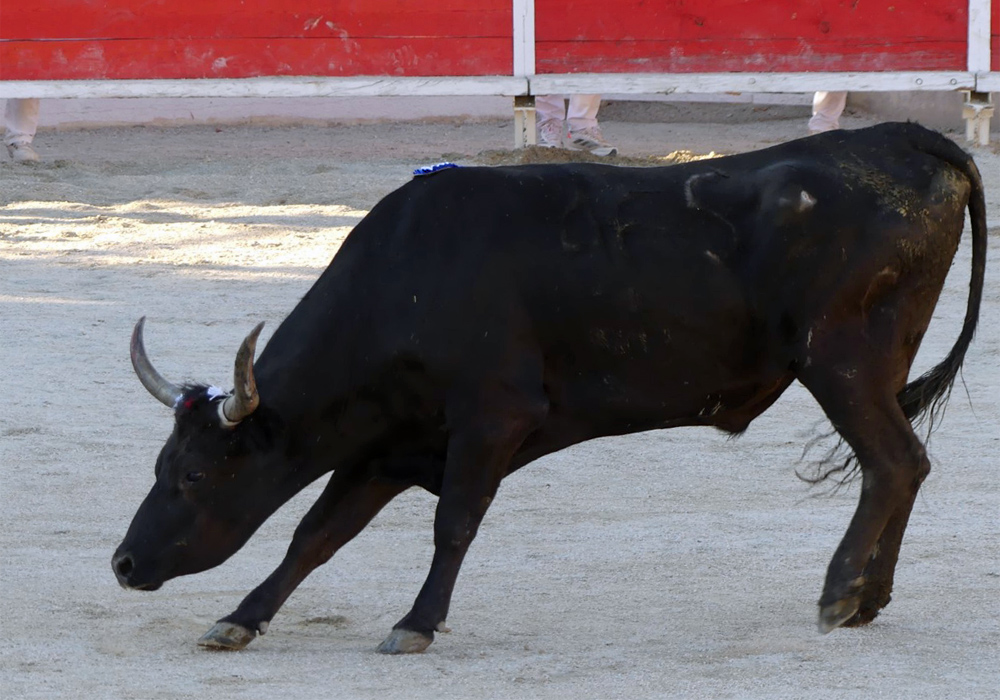 Mais là les hommes réagissent différemment. Comment s’en approcher et essayer de lui enlever ses attributs ? Coup de tête qui met ses cornes même disparates en avant pour dévier le crochet. Naïm devient le roi du plongeon et se retrouve en contre-piste tête la première sous l’assaut de Mardieul. Lopez ramasse le gland. La coupe pour Cadenas. Naïm dans la sollicitation et en avant toute à la barrière sous l’air de Carmen. Puis Mardieul se cale, laisse passer parfois. Belles sollicitations de Cadenas et de Naïm. Rageur, le taureau dégonde trois planches derrière Cadenas. Passage de El Mahboub qui lui ravit la cocarde. Cadenas se l’entreprend, passe, repasse, mais la corne dévie sa trajectoire. Il tient l’homme en respect, mais cela ne décourage pas Cadenas qui revient sur son travail. Magnifique raset pour Joachim Cadenas, le raset qui porte, qui fait applaudir, le raset marquant et gland dans son crochet. À la ficelle, encore Cadenas qui met en valeur le taureau dans une demande/réponse on ne peut plus glorieuse. Rentre ses ficelles, retour en musique et 5 fois Carmen entendu en piste. Combatif, réceptif à la demande, connaissant ses points forts : ses cornes.