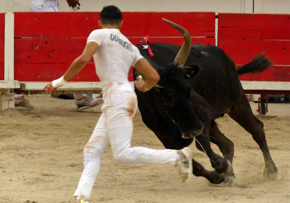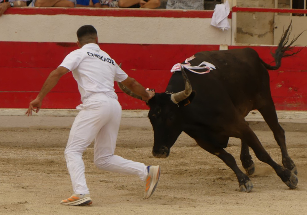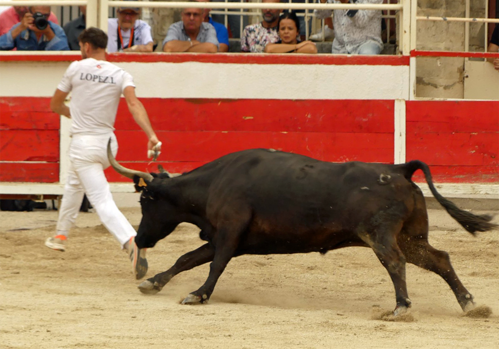 Pour le Trophée de la Corne d’or Cadenas est en tête avec 34 points. Lopez, 24 points, peut encore distancer Cadenas s’il s’investit. Ce taureau compte pour les points au Trophée du jour. Lopez comprend l’enjeu, il faut passer. La coupe pour Charrade, cocarde et gland pour Zekraoui et Lopez le deuxième gland. 26 points. Restent les ficelles. Avec l’appui des raseteurs, le taureau se voit super sollicité, ça passe, ça craque. Grenadier dégoupille et frappe après Chekade, après Lopez. Une ruée au plus fort et une belle résistance malgré l’assaut subi. Ficelle pour Lopez ; 30 points. Il reste une dernière ficelle, petitement en-cocardée. Reprise de la charge des hommes, mais Grenadier laisse passer, et finit par la garder cette ficelle. Retour en musique et 3 Carmen en piste. Très belle résistance pour un assaut de tous les dangers.