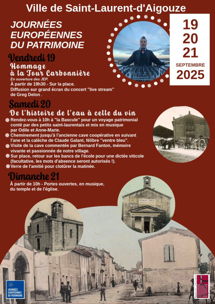 À l’occasion des Journées Européennes du Patrimoine 2025, la Ville de Saint-Laurent-d’Aigouze propose un programme riche en découvertes et en convivialité.