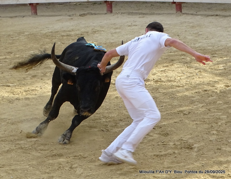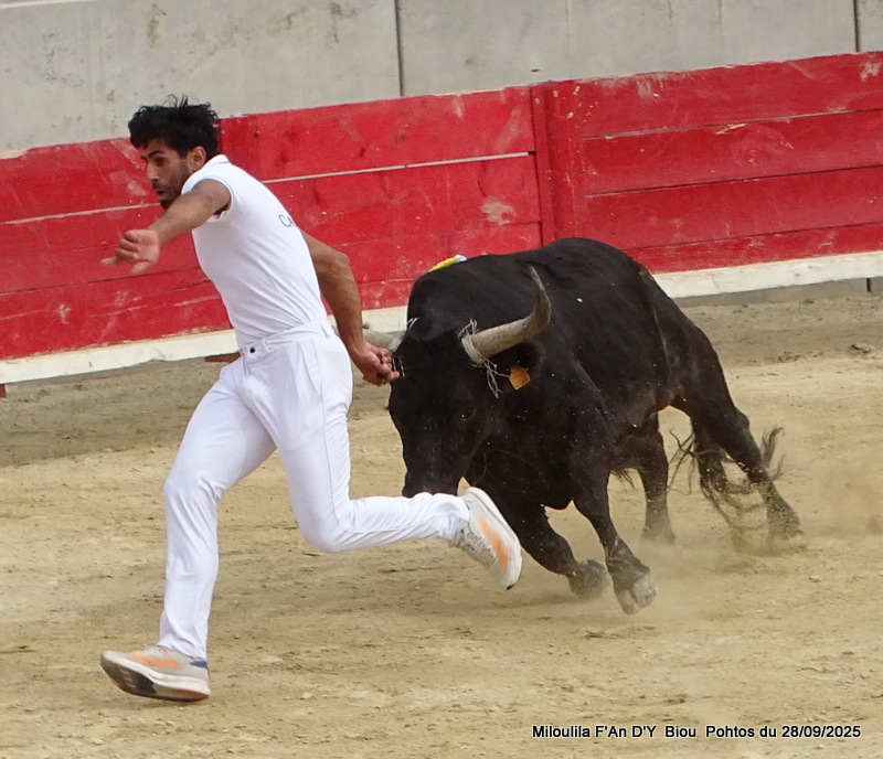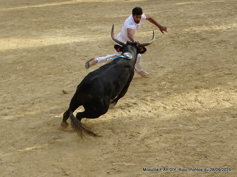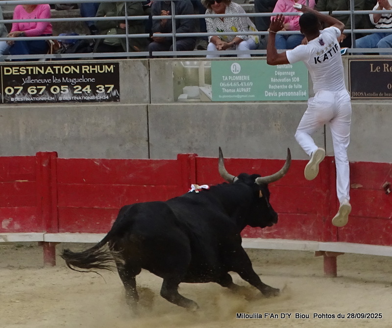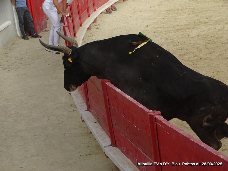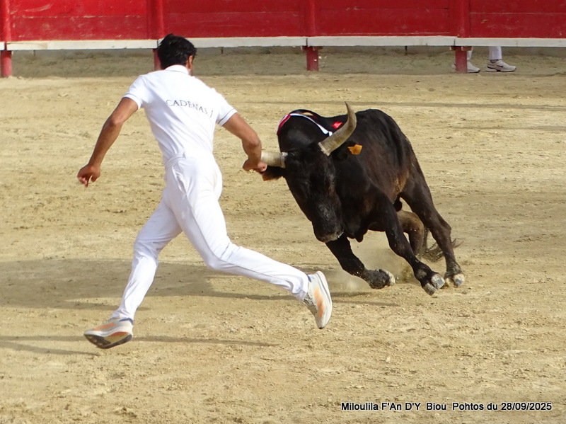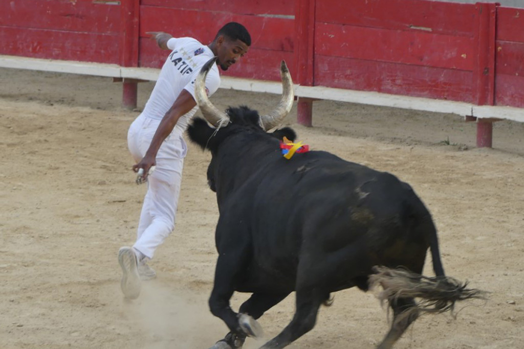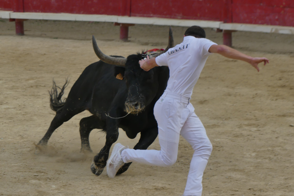 Chanat l’entreprend ; réponse assurée et ramassage du gland, puis la coupe et ensuite la cocarde. Boukharta finit le deuxième gland. Aux ficelles, départ de Cadenas pour la sape. Katif est ramené à la barrière sous l’air de Carmen tant la réponse est franche et directe, tête en avant et cornes pointées vers l’adversaire. Une fois de plus Katif dans la démarche et réponse de Zocato. Cadenas repart à la sape, sape plus que soutenue et efficace, la ficelle se fragilise et les hommes sont dans l’accueil. Ca se bouscule dur au devant du taureau, c’est à qui arrivera à la lui prendre cette ficelle qui pendouille, Et c’est Boukharta qui y arrive . À la deuxième, il se cale en son milieu, le travail des ficelles part de droite comme de gauche. Chanat se trouve serré à la barrière lors de sa demande et Carmen résonne. Belle réponse de Zocato sur Laurier le tout en musique ; Chanat finit la prise. Retour en musique et 5 Carmen en piste. Sait se servir de ses cornes et ses armes peuvent être dangereuses. Vif, leste, combatif, anticipateur, il remporte le prix du jour.