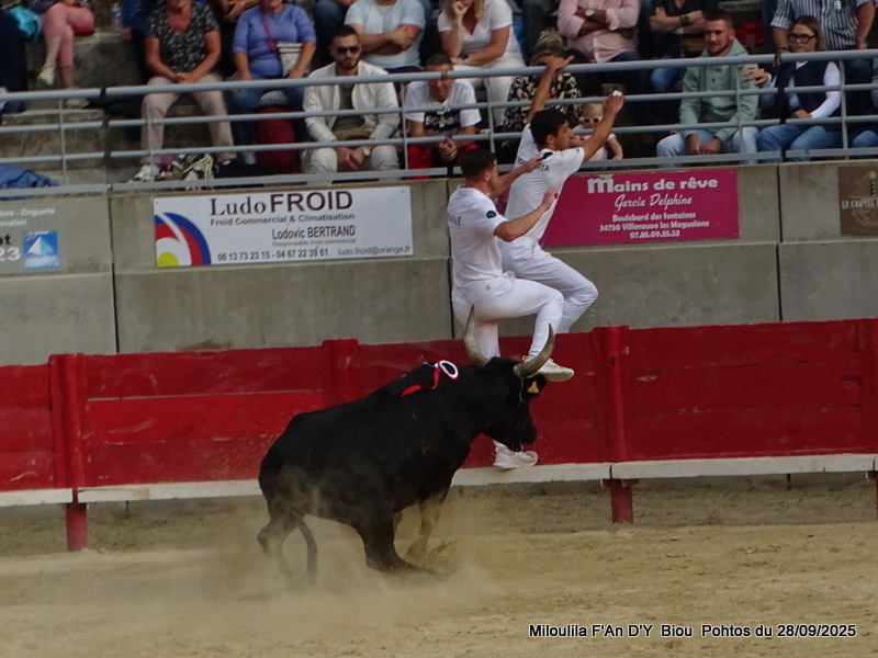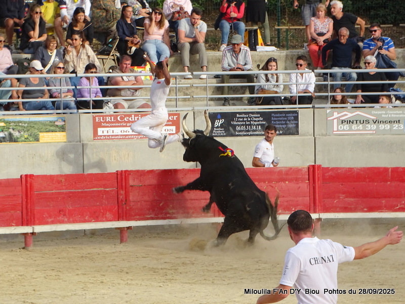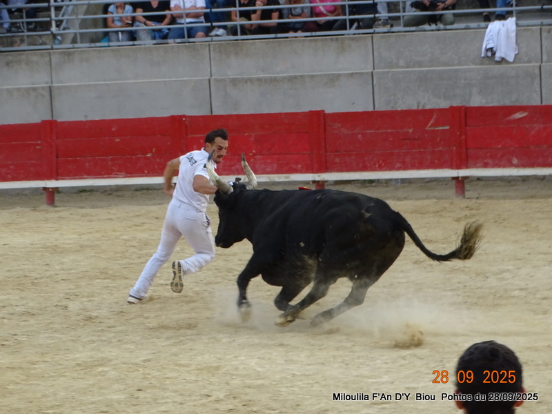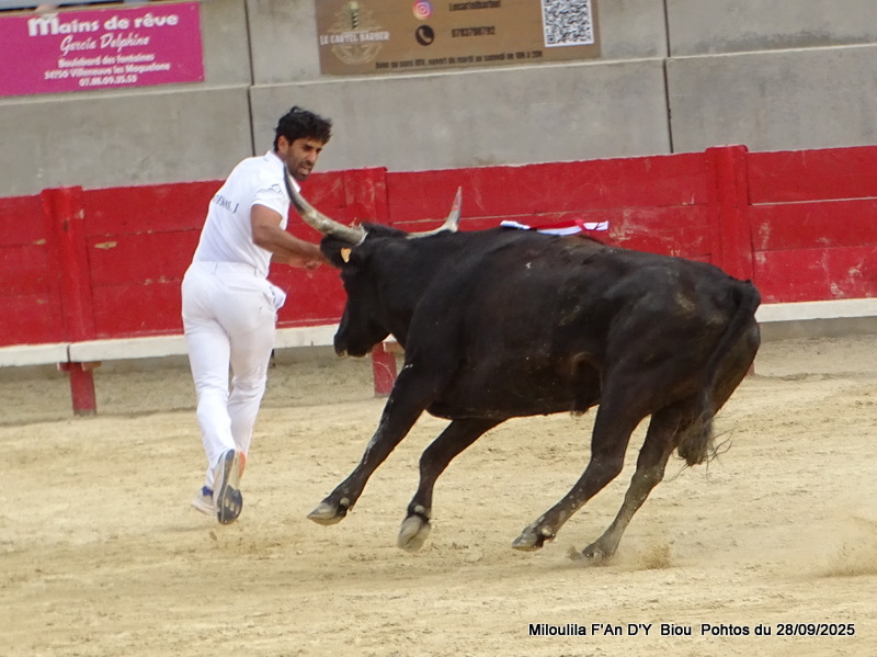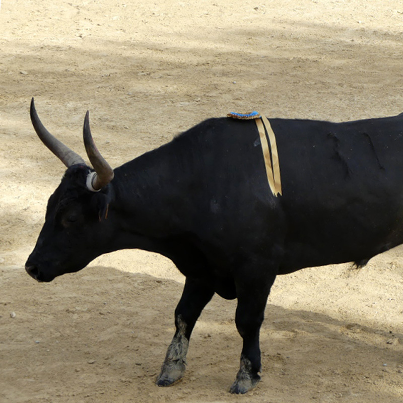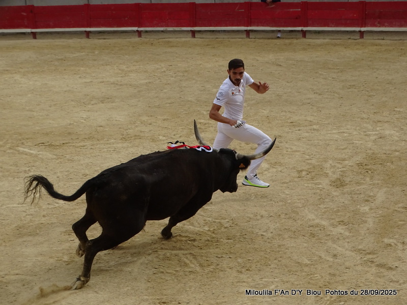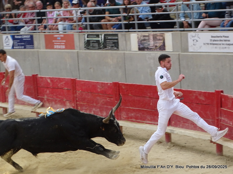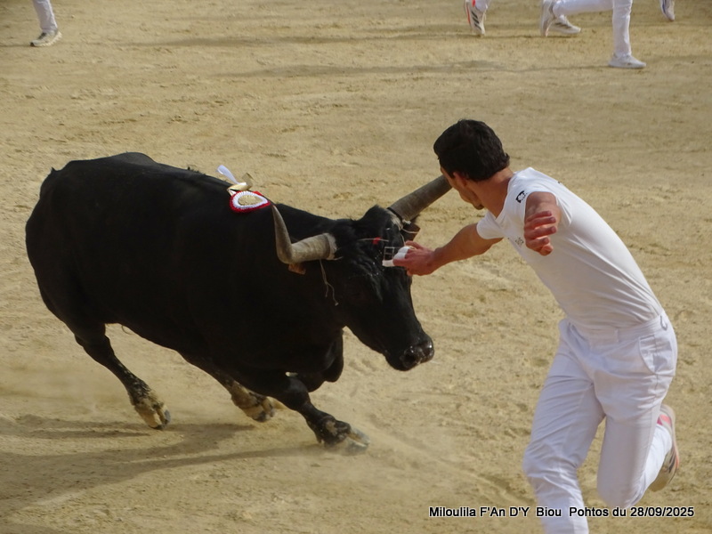 Chanat l’entreprend ; réponse assurée et ramassage du gland, puis la coupe et ensuite la cocarde. Boukharta finit le deuxième gland. Aux ficelles, départ de Cadenas pour la sape. Katif est ramené à la barrière sous l’air de Carmen tant la réponse est franche et directe, tête en avant et cornes pointées vers l’adversaire. Une fois de plus Katif dans la démarche et réponse de Zocato. Cadenas repart à la sape, sape plus que soutenue et efficace, la ficelle se fragilise et les hommes sont dans l’accueil. Ca se bouscule dur au devant du taureau, c’est à qui arrivera à la lui prendre cette ficelle qui pendouille, Et c’est Boukharta qui y arrive . À la deuxième, il se cale en son milieu, le travail des ficelles part de droite comme de gauche. Chanat se trouve serré à la barrière lors de sa demande et Carmen résonne. Belle réponse de Zocato sur Laurier le tout en musique ; Chanat finit la prise. Retour en musique et 5 Carmen en piste. Sait se servir de ses cornes et ses armes peuvent être dangereuses. Vif, leste, combatif, anticipateur, il remporte le prix du jour.