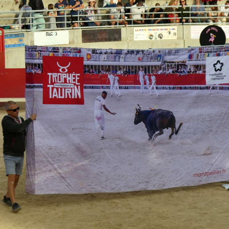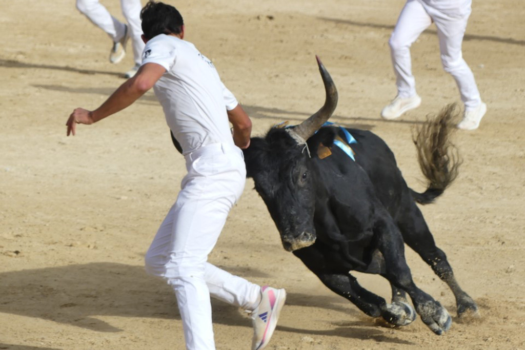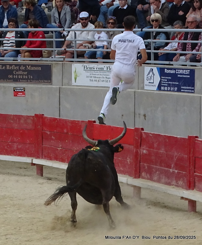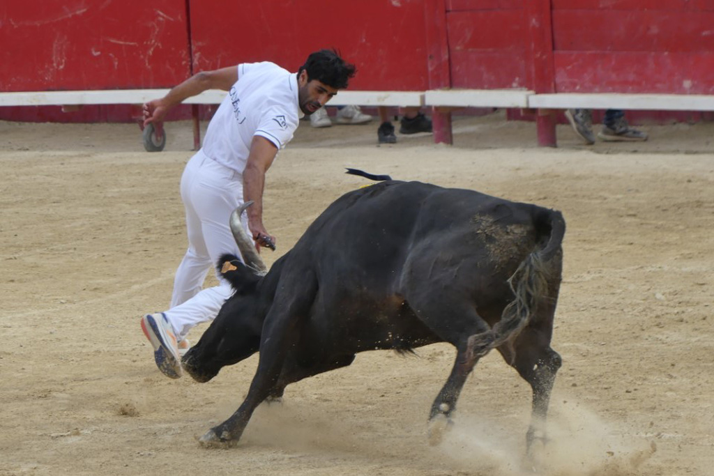 Enveloppe la piste et la balaie, c’est plus sûr ! Course Martinez, premier gland pour Katif et deuxième pour Cadenas. Il prend toutes les demandes et avec force et détermination, la coupe pour Cadenas et la prise de la cocarde pour Martinez. Aux ficelles, beau raset de Laurier qui conduit Origan à la planche sur l’air de Carmen. Saute après Martin qui en réchappe juste, ayant été surpris. Se soulève derrière Martinez, de l’action, de la générosité. Une nouvelle fois, Laurier en demande et réponse soutenue d’Origan jusqu’à retomber en contre-piste. Les raseteurs partent au démarmaillage, belle résistance d’Origan. Katif démontre son savoir et l’emmène avec lui, derrière lui, sur l’air de Carmen. La ficelle est « malade », et la poussée des hommes est ardue. Une nouvelle fois Katif dans la détermination et réponse vive jusqu’à se soulever de Origan. Les passages sont nombreux et il faut une belle détermination et bravoure pour résister à la poussée des hommes. À la toute dernière seconde Martinez la lui ramasse ainsi qu’un coup de pointe de corne au bras. Rentre sa seconde ficelle en musique, plus fois Carmen en piste durant son quart d’heure.
