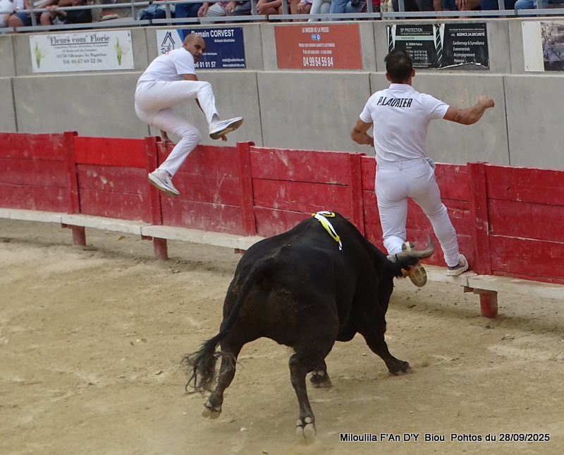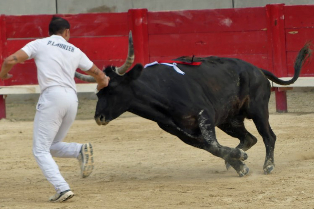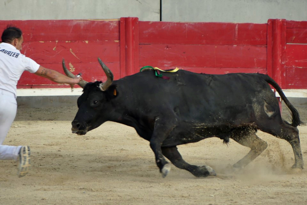 Mourre baissé, il gratte le sol avec rudesse. Puissant, il montre une belle détermination face à l’adversaire. La coupe pour Laurier, ensuite la cocarde puis les glands pour Chanat et Cadenas. Aux ficelles, le jeu se corse, Martin se fait anticiper sur une demande et il faut vite arriver à la planche, sinon gare ! Tous deux en course parallèle ! Difficile, Lou Mamaï ! hargneux, vif, il ne laisse rien passer. Chanat en mode passe, le taureau en mode suivi et lourd et la détente jusqu’à l’arrivée aux planches. Mais le taureau se blesse à la patte et sur demande du manadier doit regagner le toril. Mais même lors de son retour, trouve encore le moyen de casser la planche et saute après Laurier. Du répondant, un barricadier à la clef, avec un brin de méchanceté. À revoir, vite… (Musique au retour et une fois Carmen en piste.