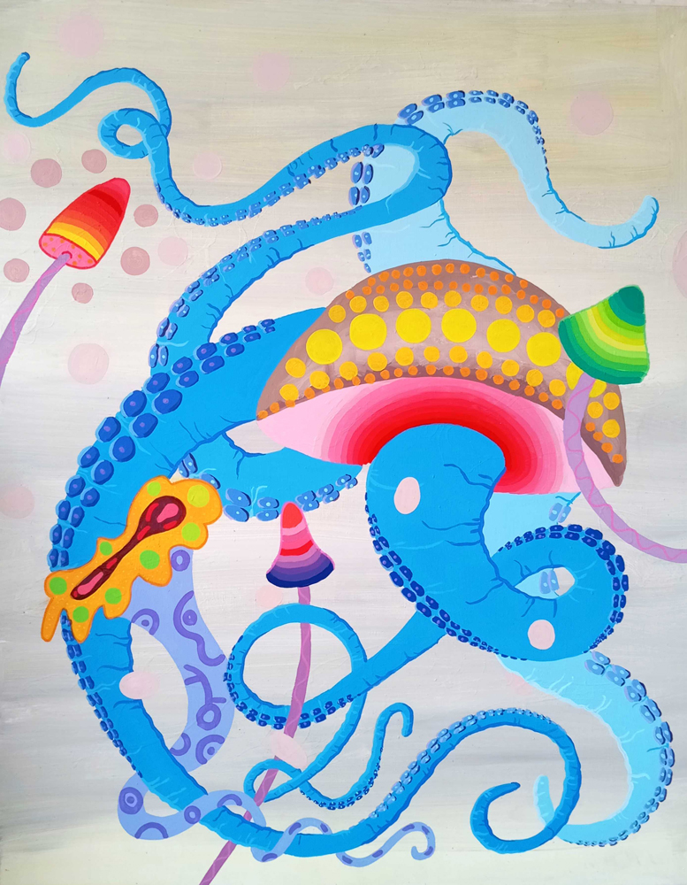 Les derniers tableaux sont oniriques, colorés, et révèlent une multitude de détails. « Je pars d’une tache de couleur » explique-t’il simplement et humblement. « Je vois ensuite des choses, qui apparaissent, des personnages, des paysages. » Il laisse le public s’y plonger pour à son tour vagabonder dans ses tableaux. « Chacun peut interpréter comme il ressent. »