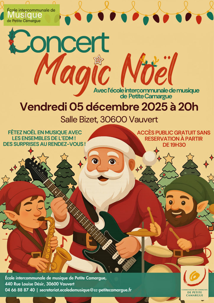 L’École Intercommunale de Musique de Petite Camargue vous invite à célébrer les fêtes de fin d’année lors de son grand Concert de Noël, le vendredi 5 décembre à 20h, à la salle Bizet de Vauvert (accès public dès 19h30).