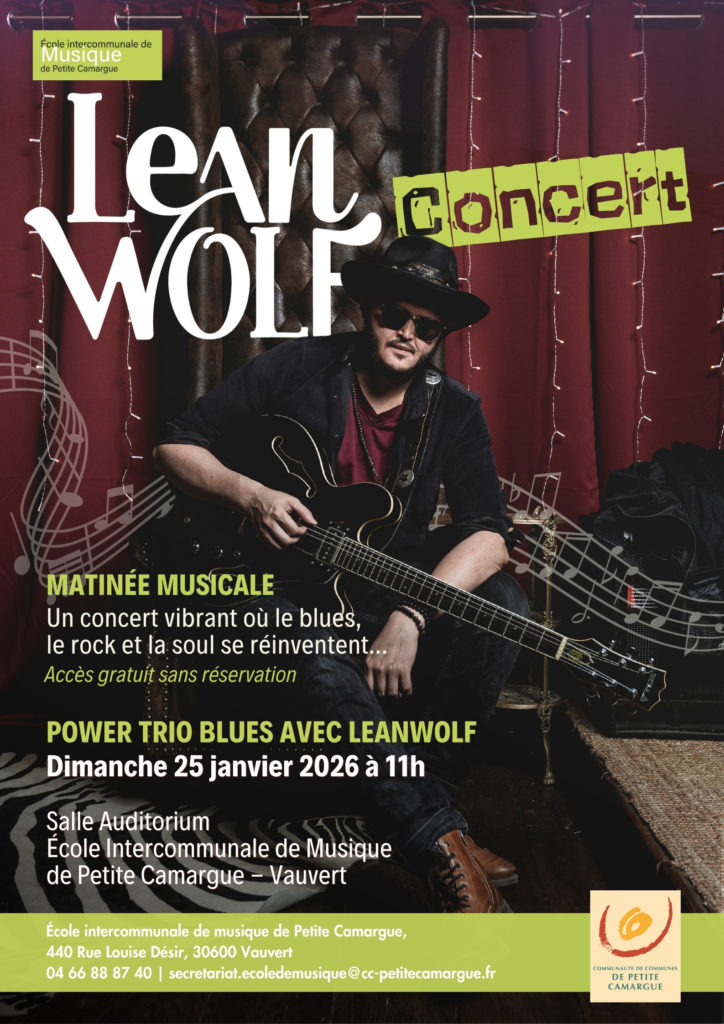 La Communauté de communes de Petite Camargue et l’École intercommunale de musique à Vauvert, ont le plaisir d’accueillir LeanWolf, jeune guitariste et chanteur à la virtuosité éclatante, pour un concert exceptionnel placé sous le signe de l’émotion et de la puissance musicale.
