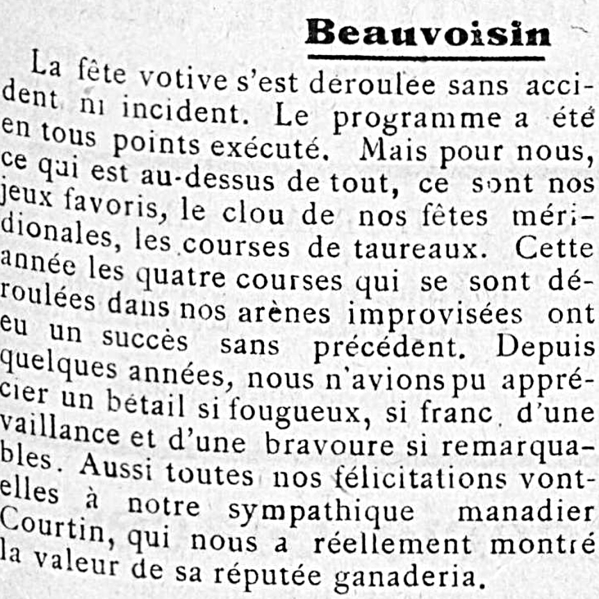 En 1907, ami de Baroncelli, il fait venir » Prouvenço » à l’occasion de la course en faveur des inondés, qui se déroule au bout de notre impasse (impasse du grand jardin) devenu propriété de Paul Roque.
