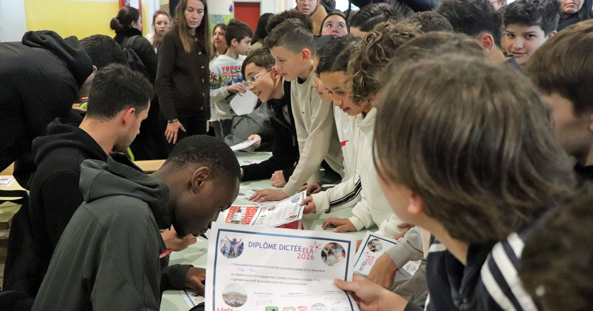 À l’issue de la dictée, une remise de diplômes de participation a été organisée. Les élèves ont également eu l’opportunité d’échanger avec les joueurs ,d’obtenir une signature de leur diplômeet un poster de l’équipe de Nîmes olympique qu’ils ont pu faire dédicacer ; rendant ce moment encore plus mémorable. Comme le parrain de l’association ELA, qui lutte contre les leucodystrophies n’est autre que l’immense joueur champion du monde Zinedine Zidane, il a semblé naturel de lier à cet événement à notre équipe nîmoise.