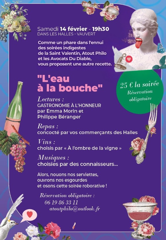 | Atout Philo, Les Avocats Du Diable et les commerçants des Halles de Vauvert vous proposent une soirée unique pour le 14 février ! (Il paraît que c’est la Saint Valentin… Affranchissez-vous des habitudes conformistes… ) |