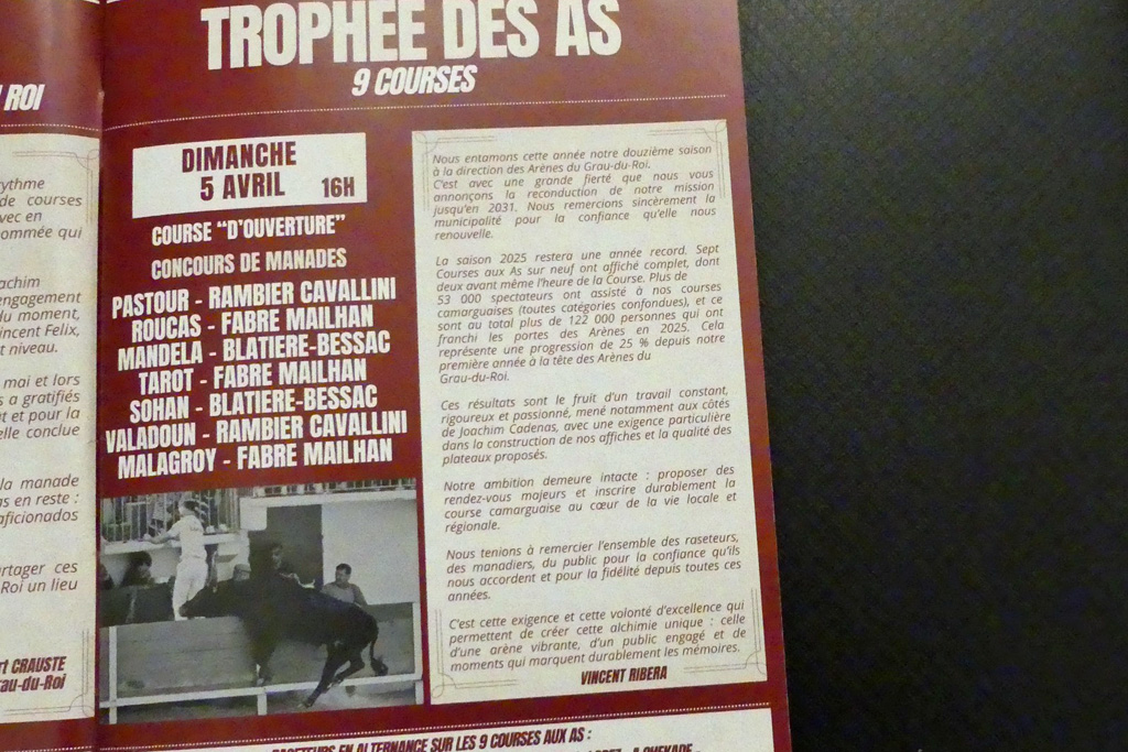 Entre la vie et la mort, le raset ne se pense pas. Il se vit. Et aujourd’hui, avec Vincent Ribéra, notre ligne est claire. LA Vérité. Simple et sans tromperie. Tout coule comme de l’eau claire. La technique et le métier, même nécessaires, ne sont que des outils. Loin des polémiques, que ces courses soient grandes, vivantes et surtout héroïques…Vive la Fête du Taureau ».