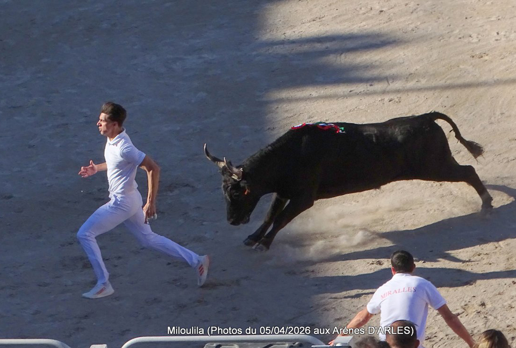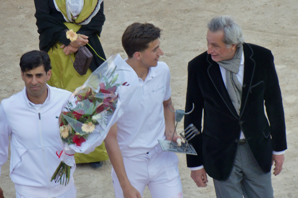 Aux ficelles, le jeu se corse, Léal en demande et Vendôme en réponse, tous deux aux planches en une très belle finition qui fait résonner Carmen. Vendôme se cale, puis hésite, droite ou gauche ? Cadenas le prend sur une traversée en puissance, tous deux en corps à corps sur l’air de Carmen. Puis suit une série de réponses soutenues aux demandes. Un beau travail des raseteurs qui dansent avec lui dans une série. Cadenas puise encore une fois et à lui la première ficelle. À la deuxième, énorme raset de Cadenas qui le tire dans la longueur et l’entraine avec lui, la réponse est à son maximum dans la beauté du geste, du moment. Rentre en musique sa ficelle et par 5 fois, Carmen en piste.
