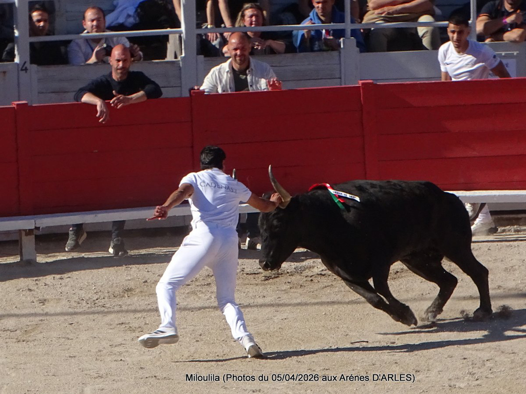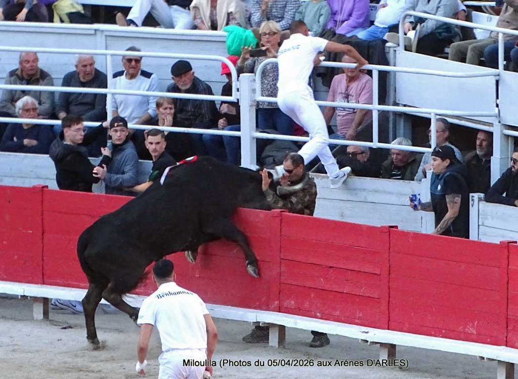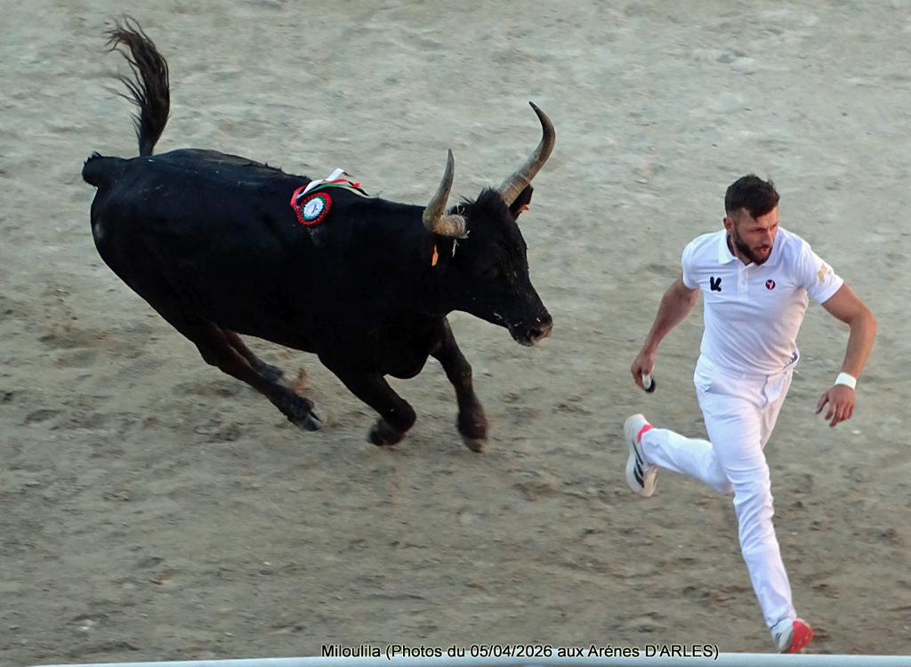 Agressif en entrant, montre une méchanceté un peu brute. Chaque homme est raccompagné direct à la barrière et sous l’œil « méchantas » du taureau. Cadenas l’engage, au mieux avec dextérité et pugnacité, le tout en musique, Zekraoui et Ayme en action, font les glands, Marignan se charge de la coupe et Cadenas de la cocarde. Aux ficelles, Léal et Ayme en mouvement pour faire plier le taureau, mais il ne faut pas la lui faire, réponses fortes et puissantes. Cadenas dans une demande où il obtient une réponse si forte, si puissante qu’il n’a de cesse de se démener à arriver le premier à la barrière tant la course en anticipation est énorme de puissance. Ne pas lâcher,  courir encore et encore sans s’arrêter. Saut Salvateur. Ouah ! Un moment à couper le souffle ! On s’aperçoit que le gland fait par Ayme est toujours sur la corne, donc le compteur repart et gland pour El Mahboub. On reprend le décompte des ficelles, Cadenas part à la sape, démarmaille pas mal, Marignan la finit. Retour en musique et 7 fois Carmen en piste.