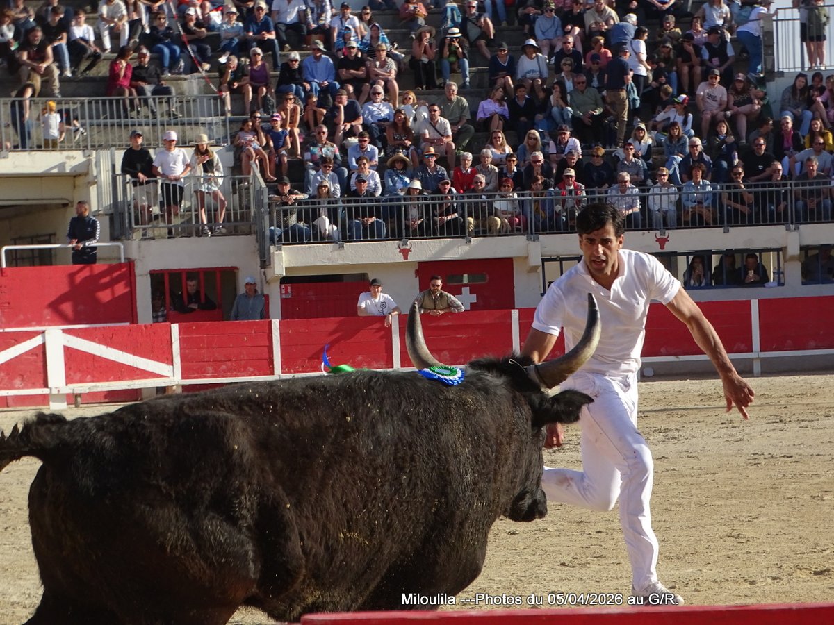 Belle bête, imposant, il prend ses marques en entrant en piste mais se fait vite ramasser les premiers attributs par Antoine Charrade pour la coupe et la cocarde et par Yassin Naïm pour les glands. Aux ficelles, se cale, cul aux planches, côté présidence et attend, fixant droit devant lui, tête haut placée, mais le moindre mouvement derrière lui le fait se retourner et menacer en dégondant les planches ; il assure aussi ses arrières. Il faut entrer en lui et pas qu’un peu, complètement. Chekade le sollicite, et c’est avec lui que le premier Carmen résonne. Pastour voit venir à lui les raseteurs mais impassible, il les laisse passer ; à quoi bon se déplacer, trop loin pour lui ; alors Joachim Cadenas s’invite à son regard, le tire, l’entraine et Carmen retentit au diapason de l’action. Chekade, Naïm en suivi avec réponse soutenue et Carmen à la clef.