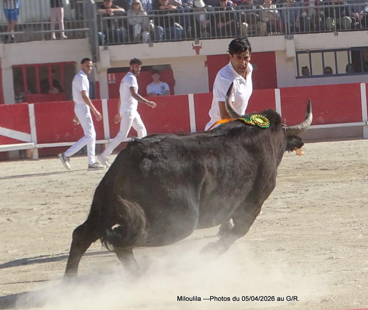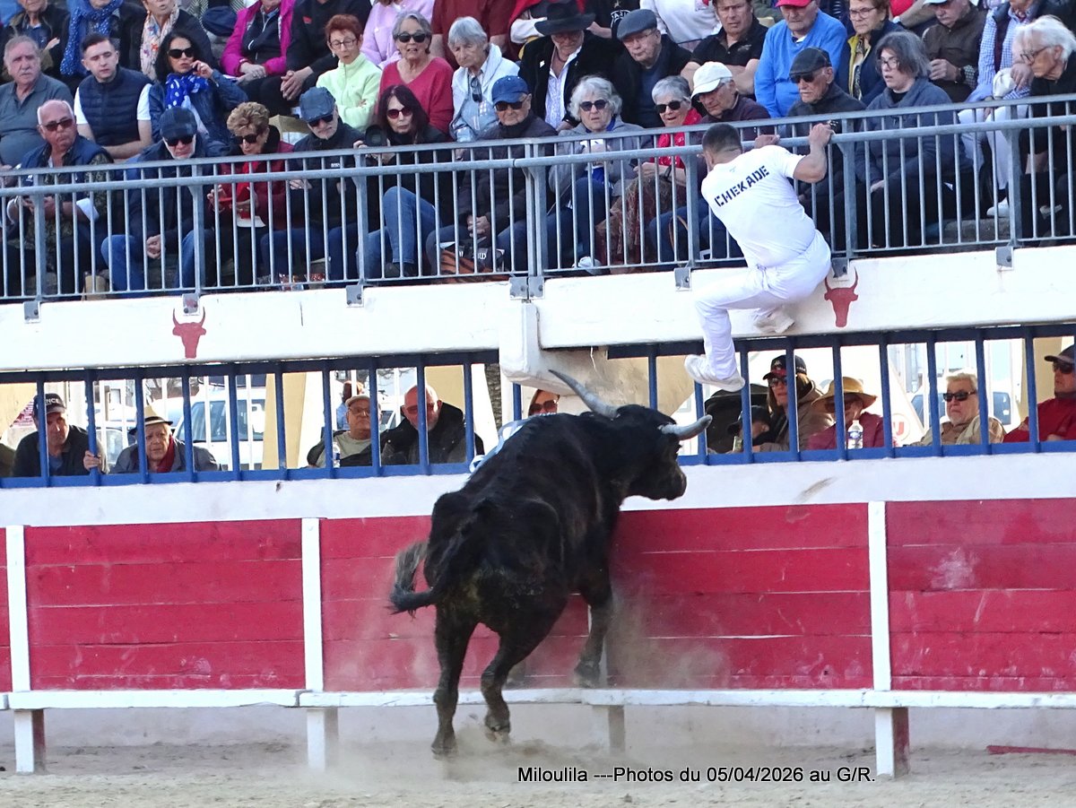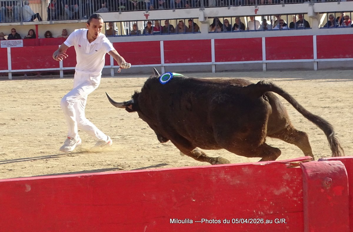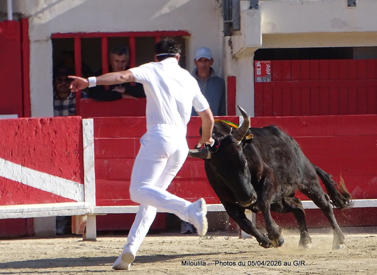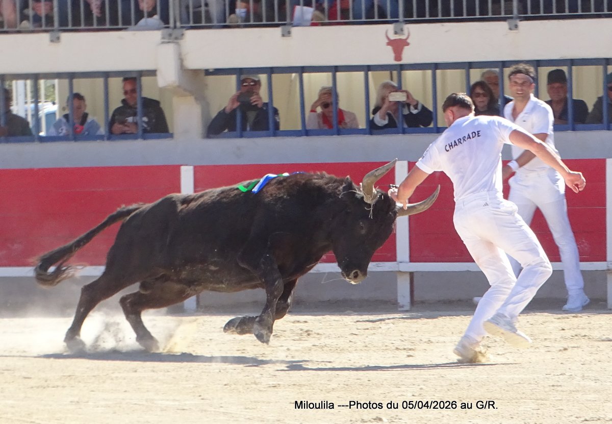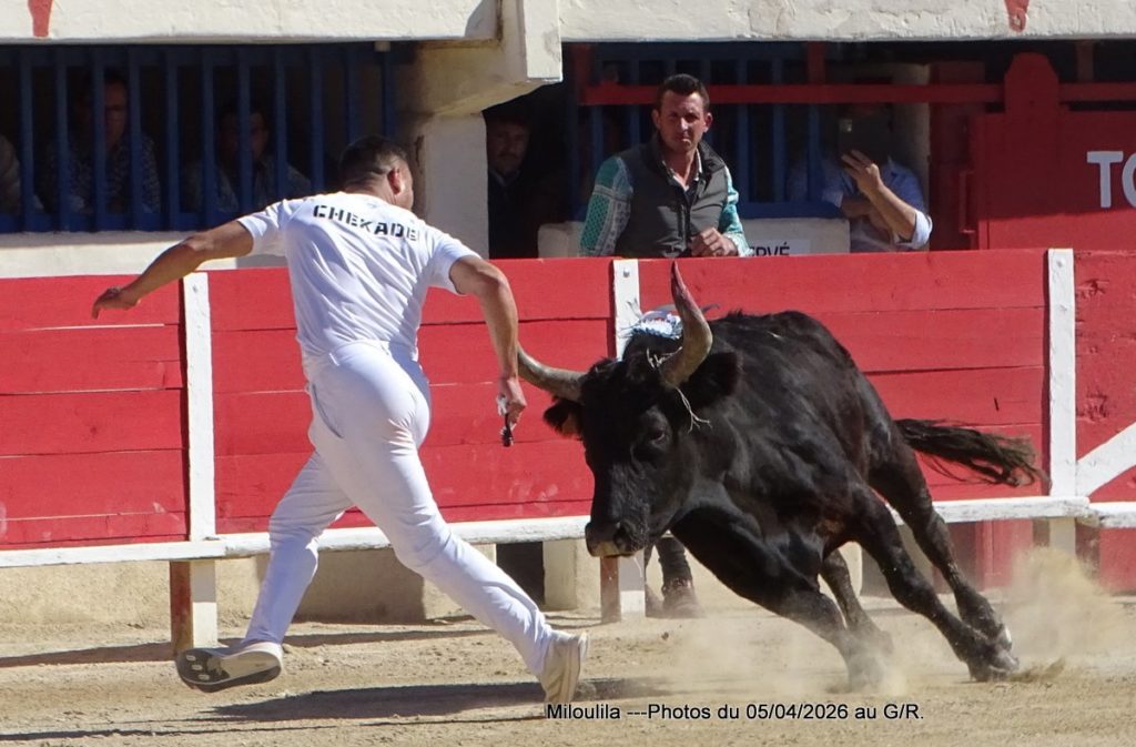 Belle bête, puissante mais ne peut évincer les hommes qui se présentent à lui. La cocarde pour Katif, Antoine Charrade et Orcel lèvent les glands. Aux ficelles, le taureau tape plus-plus les planches en regardant la contre-piste. Il faut l’occuper, Cadenas s’y met, Mandela prend le raset et tous deux sont à la barrière. Le jeu commence, tête baissée, Mandela s’engage envers les hommes. Cadenas ne le lâche pas, s’investit, craque et effiloche la ficelle, pas question de la laisser à un autre et de 1 passage, de 2 et de 3, elle est à lui. À la deuxième ficelle, Mandela fait valdinguer les planches, Cadenas continue sur sa lancée, Naïm, Katif et enfin Chekade pour la ramasse. Silence et 1 Carmen.